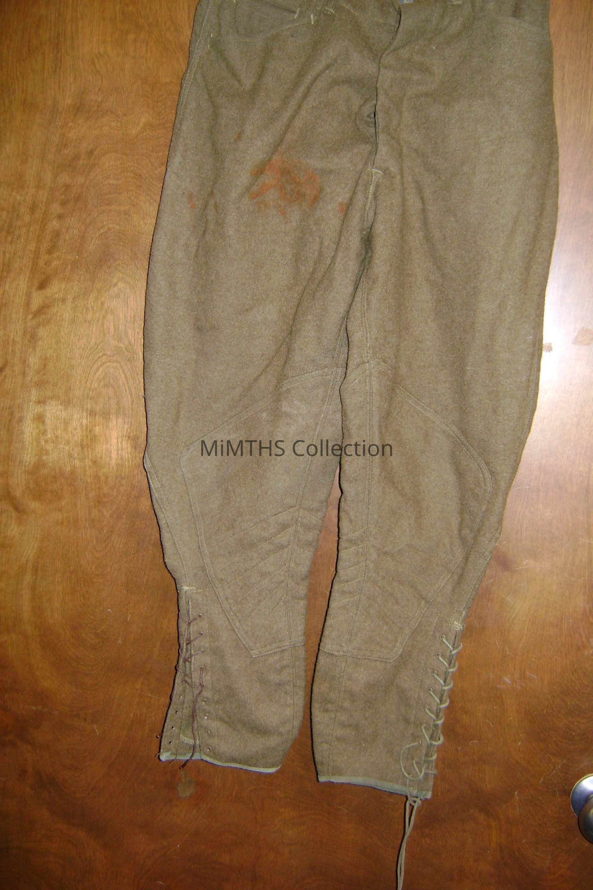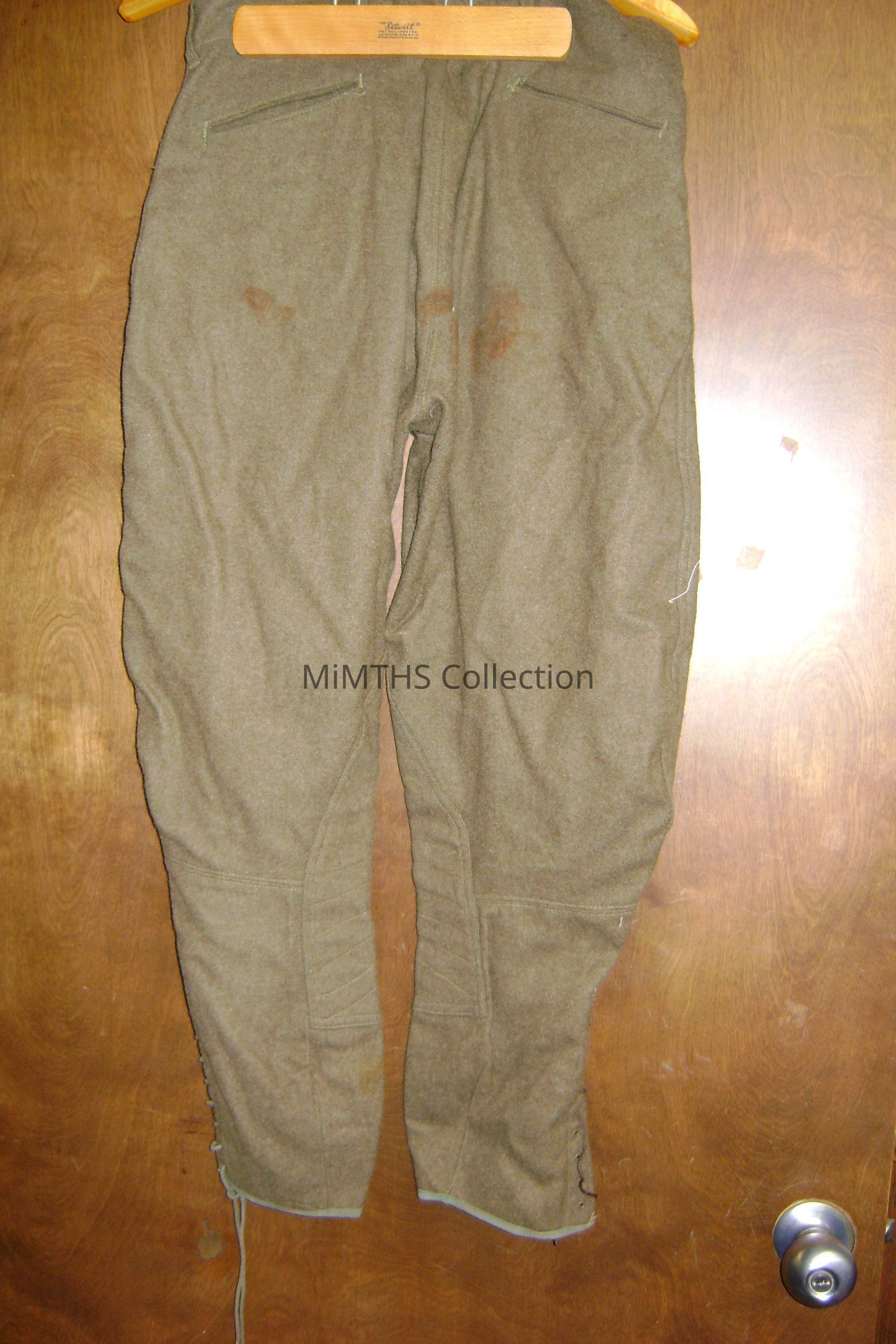 Pair of M1917 Trousers in Olive. Stitching inside has been ripped out. Notable things about the M1917: Four of the front buttons say USA while the top one says ARMY. The bottom of the pants are lace-up. Lower knees are reinforced.Cataloged By
