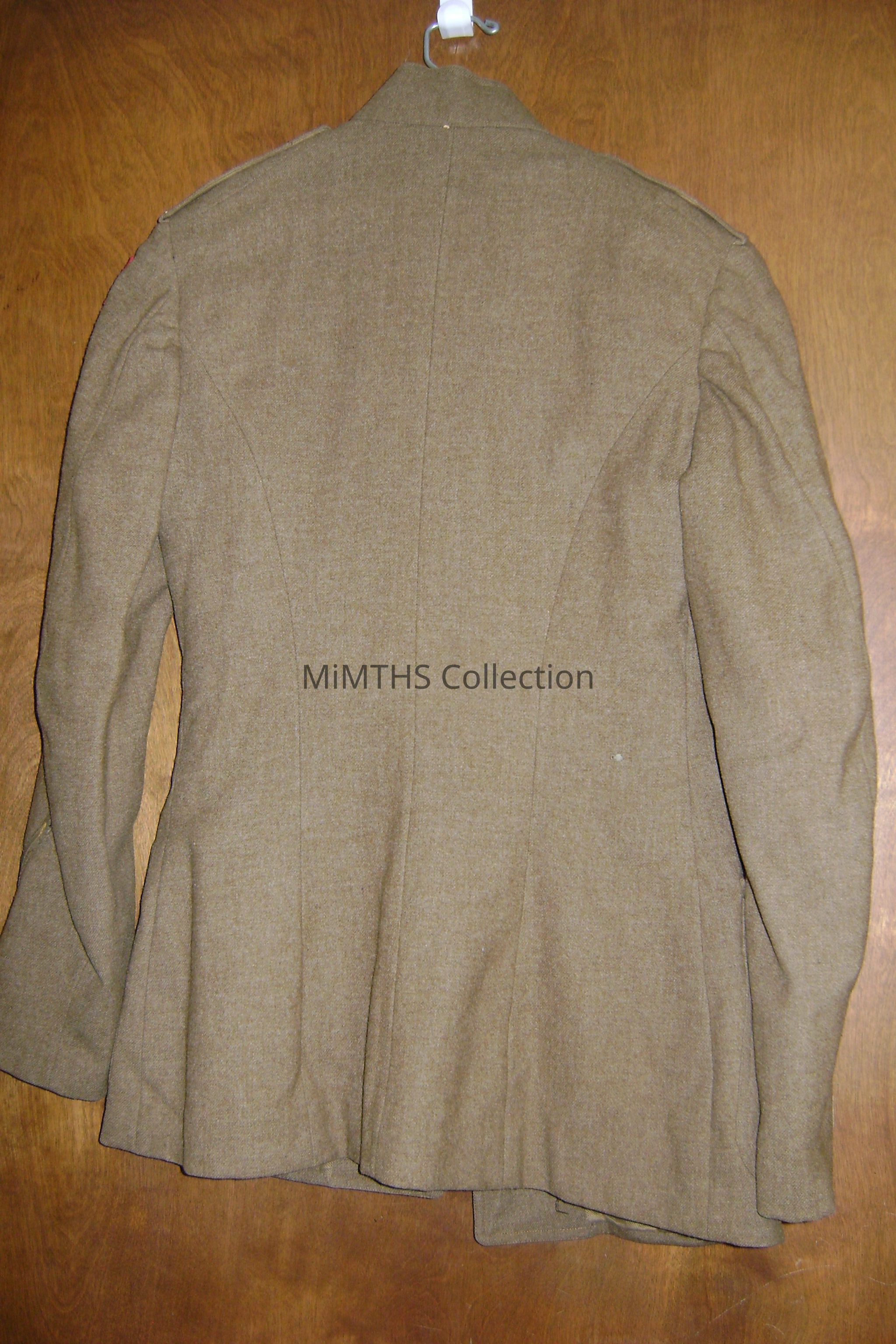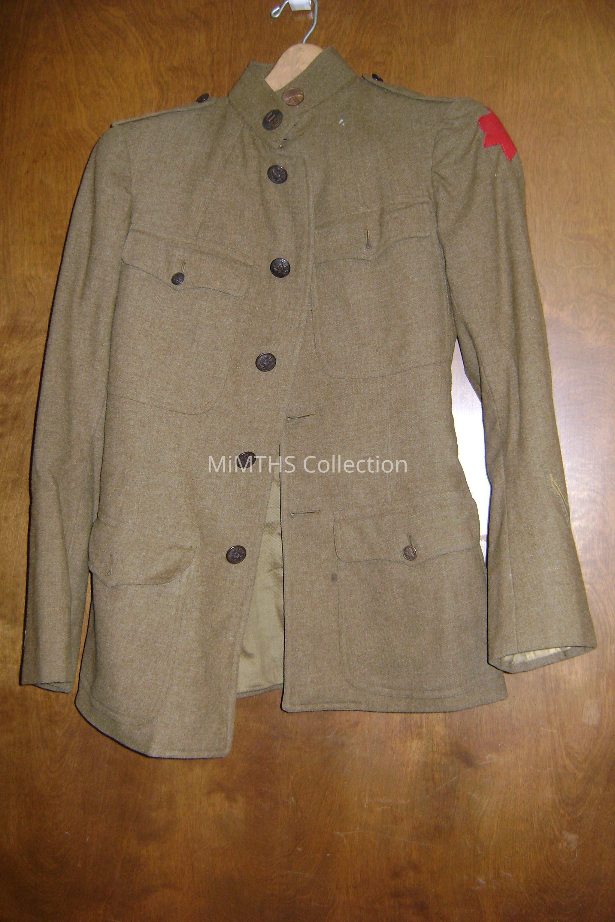 Olive 1917 wool jacket. A red 6th infantry patch is on the left arm as well as a patch indicating service overseas. A "Jacob Reeds Sons Inc" patch is stitched on the inside, indicating that the former owner had the uniform fitted.