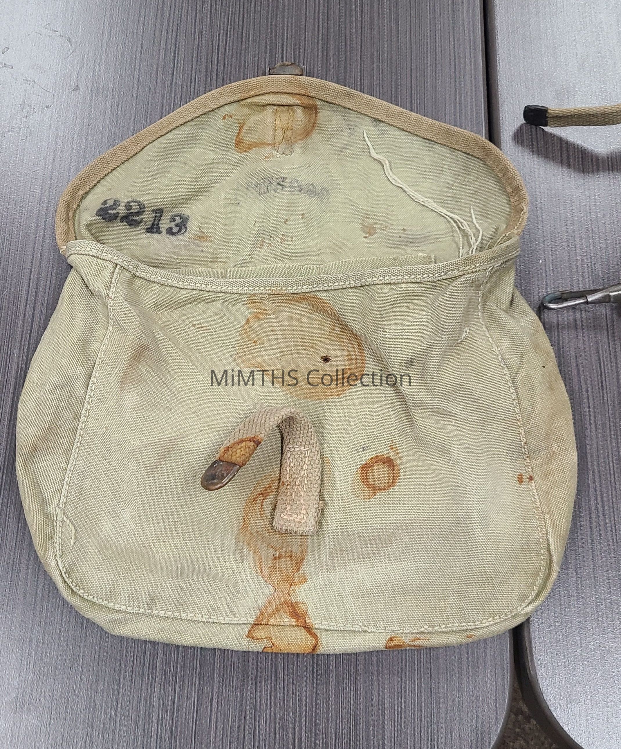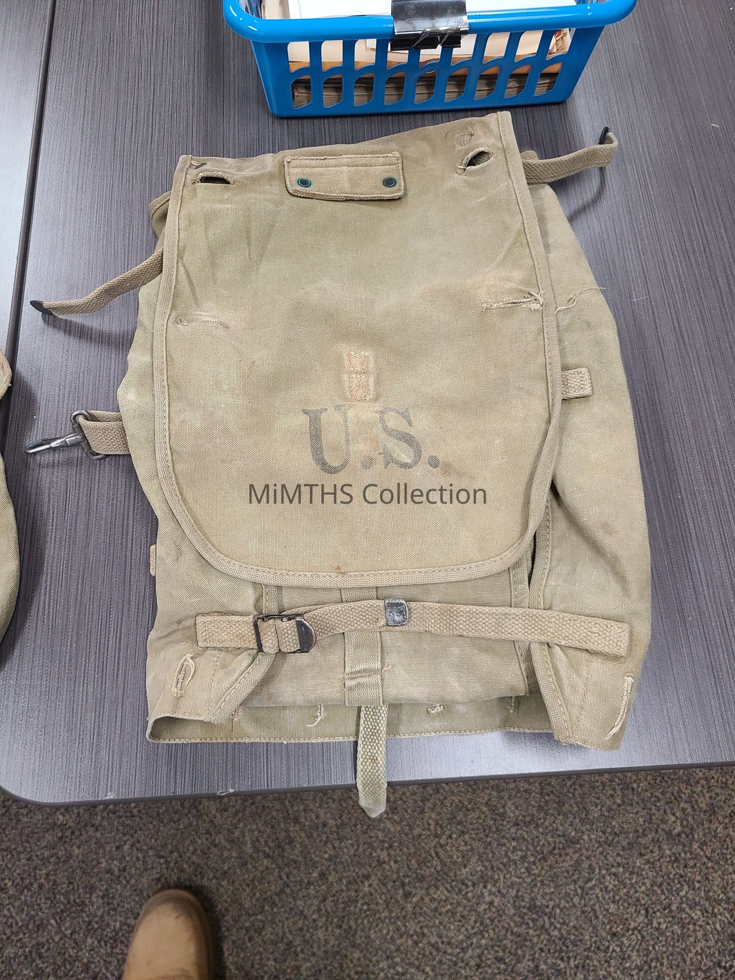 The M1928 haversack was the standard issue combat field pack used by the U.S. Army during World War II, replacing the earlier M1910 model. It was an "improved" version of the M1910 designed to carry a soldier's gear when attached to a cartridge or pistol belt.Cataloged By