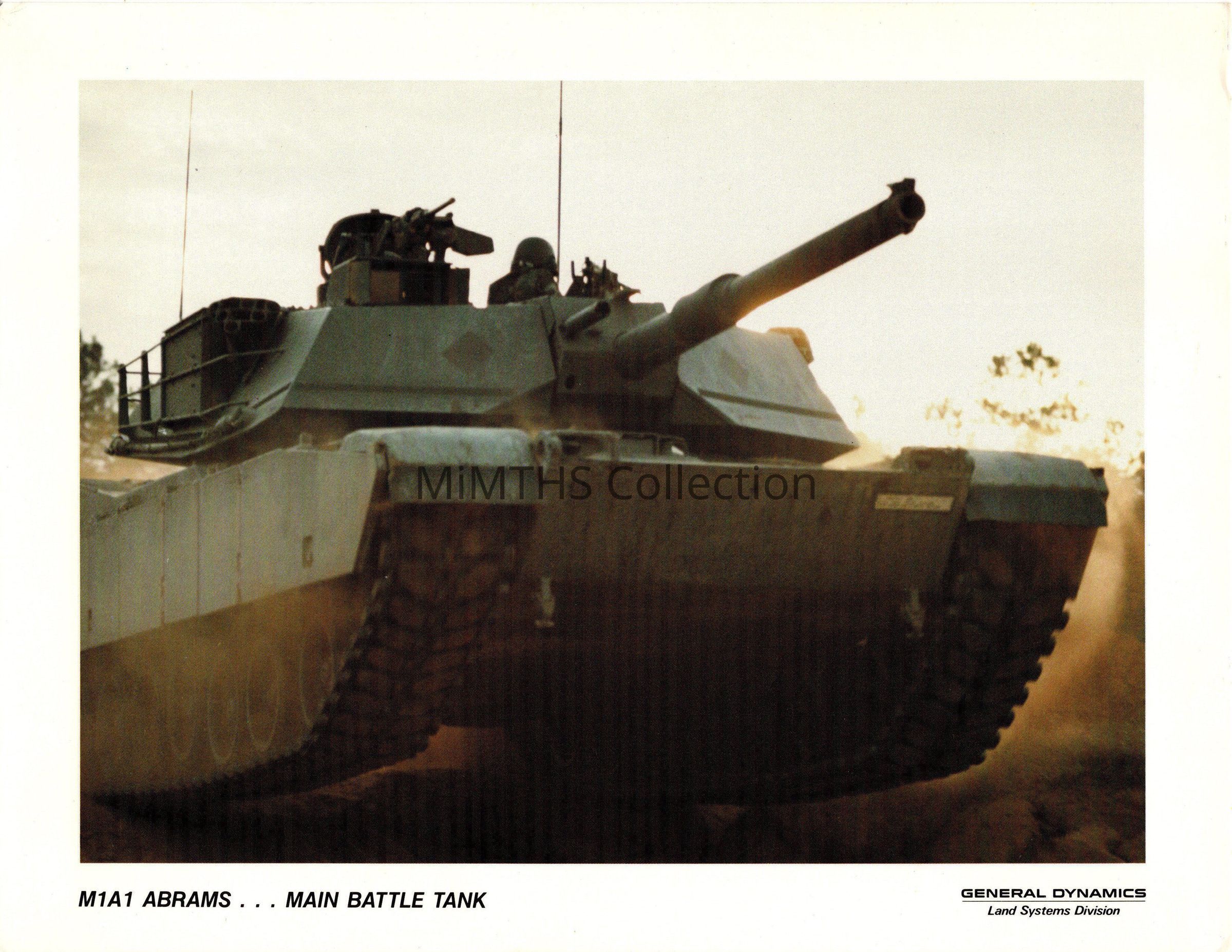Publicity card for the M1A1 Abrams Tank printed by General Dynamics. These were handed out at trade shows, air shows and open house events. This one features the M1 "basic" and dates from the mid 1980's.Photograph Details