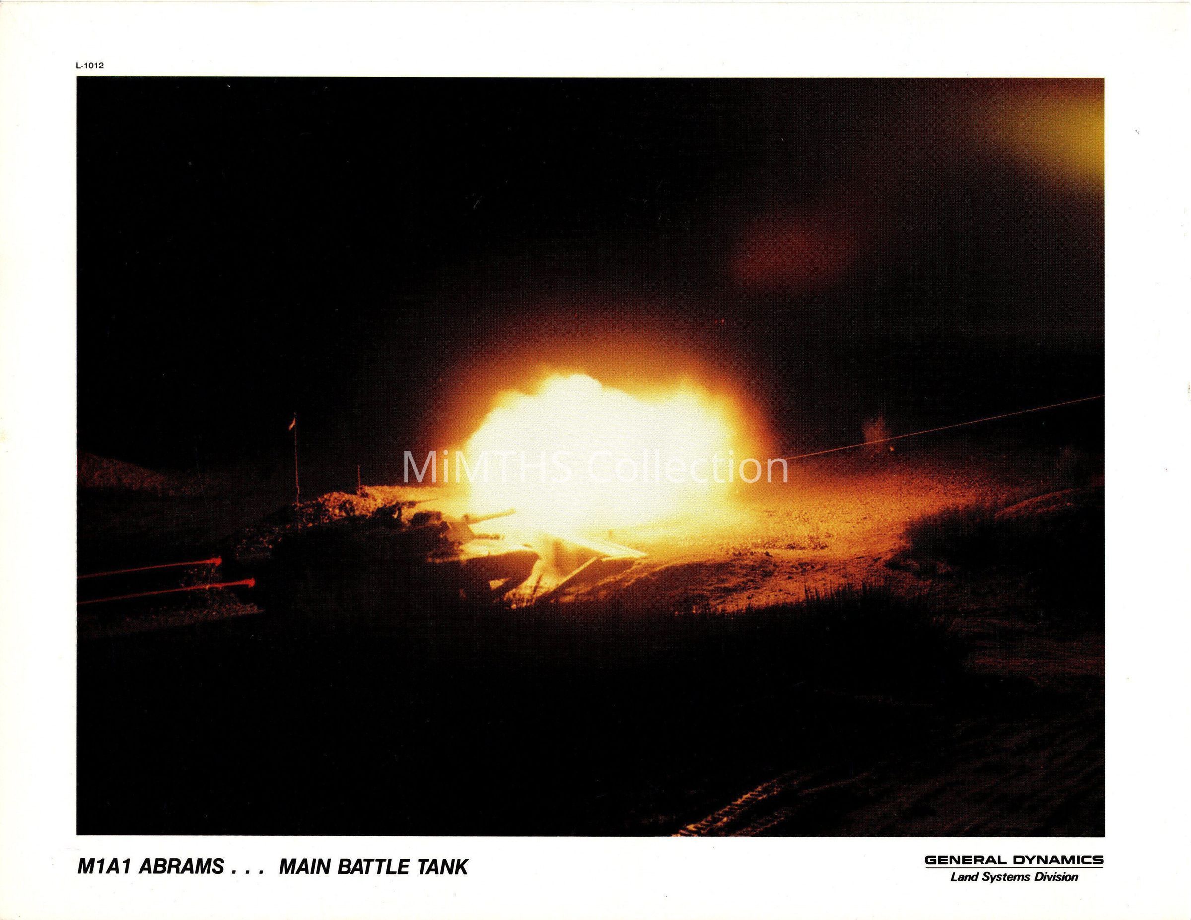 M1A1...Main Battle Tank, Photo, from right rear, elevated, firing gun, bright flash at night.Cataloged By