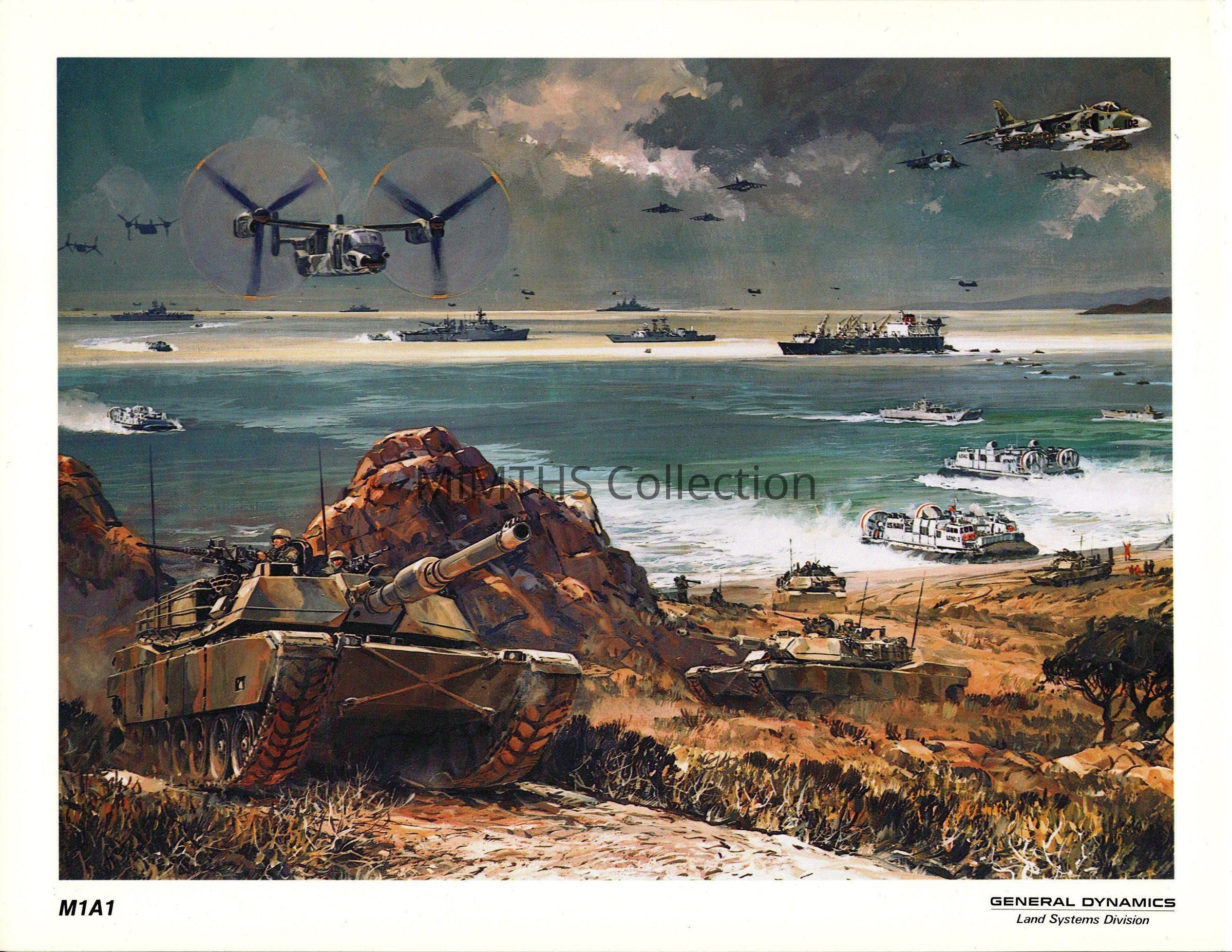 USMC M1A1, artists' rendering of amphibious landing, landing ships in background, Osprey and Harrier aircraft overhead.Acquisition