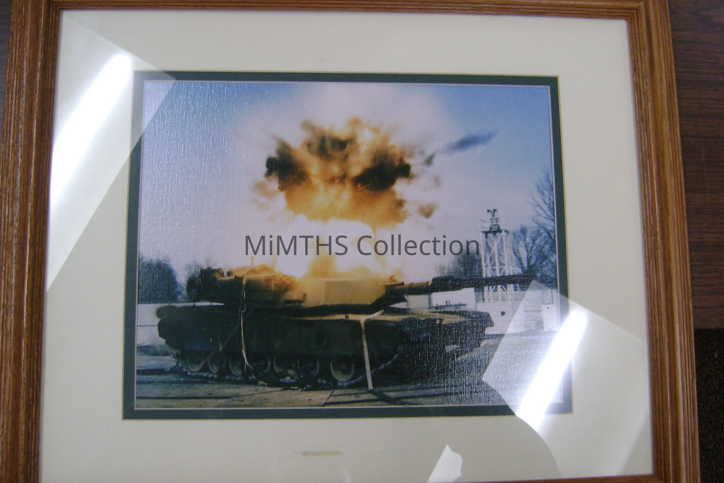 Framed image of an M1A1 Abrams tank undergoing destructive testingCataloged By