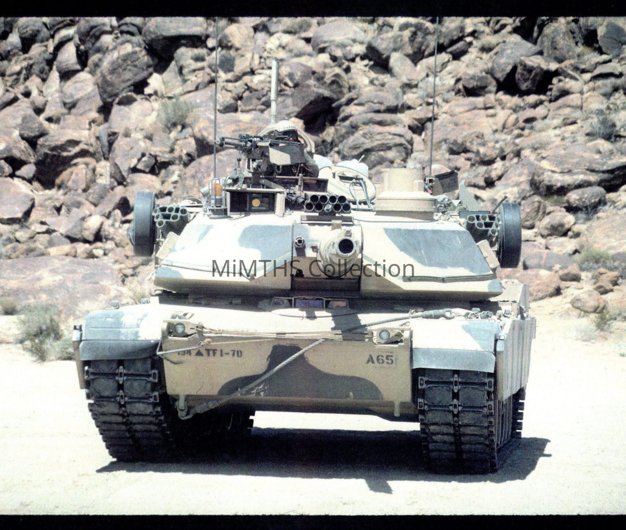 Photo of an M1A2 in tan & green cammo. Vehicle has MILES and Hoffman device fitted for training. Possibly NTC. Markings indicate TF 1-70 4ADPhotograph Details