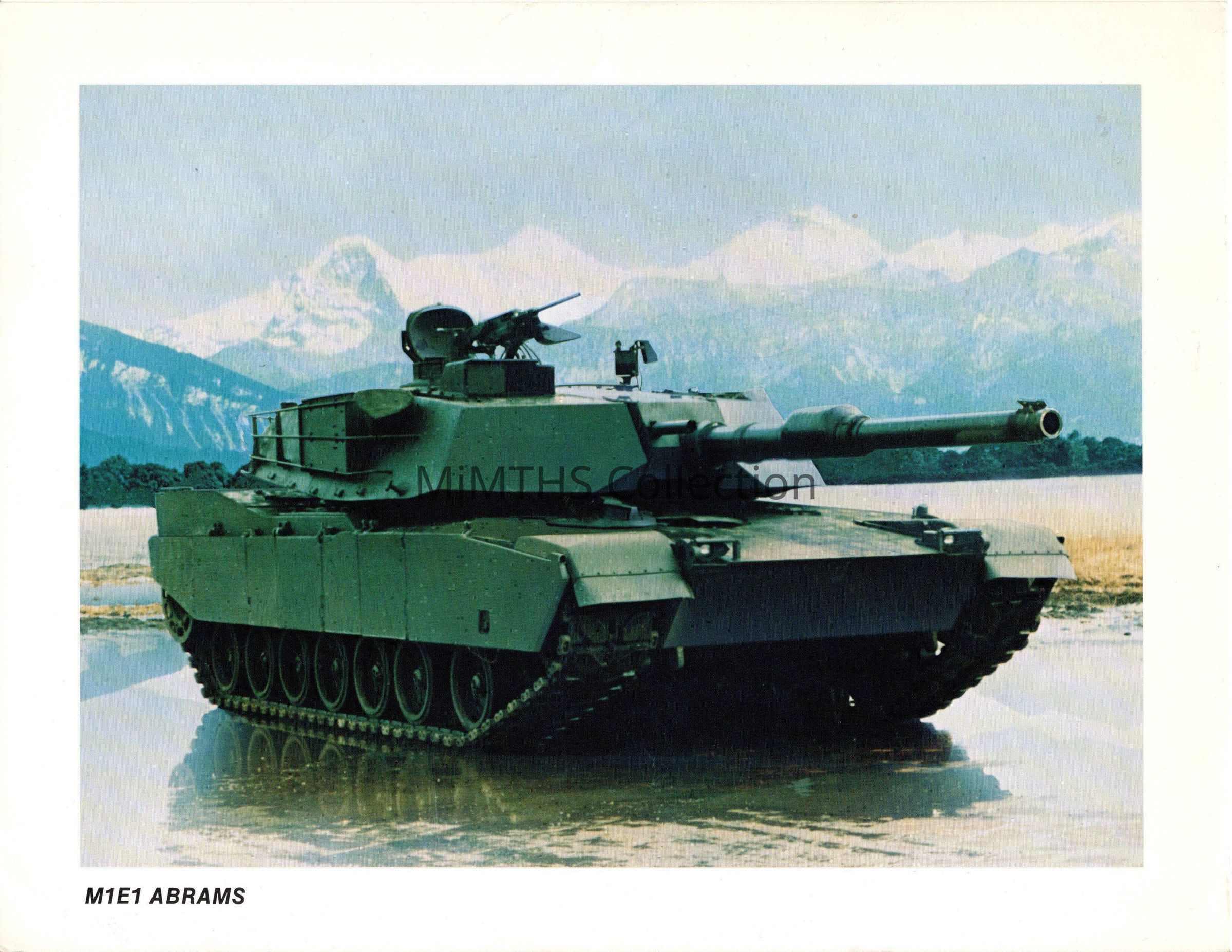 Publicity card for the M1E1 Abrams Tank printed by General Dynamics. These were handed out at trade shows, air shows and open house events. This one features the M1E1 and dates from the mid 1980's.Photograph Details
