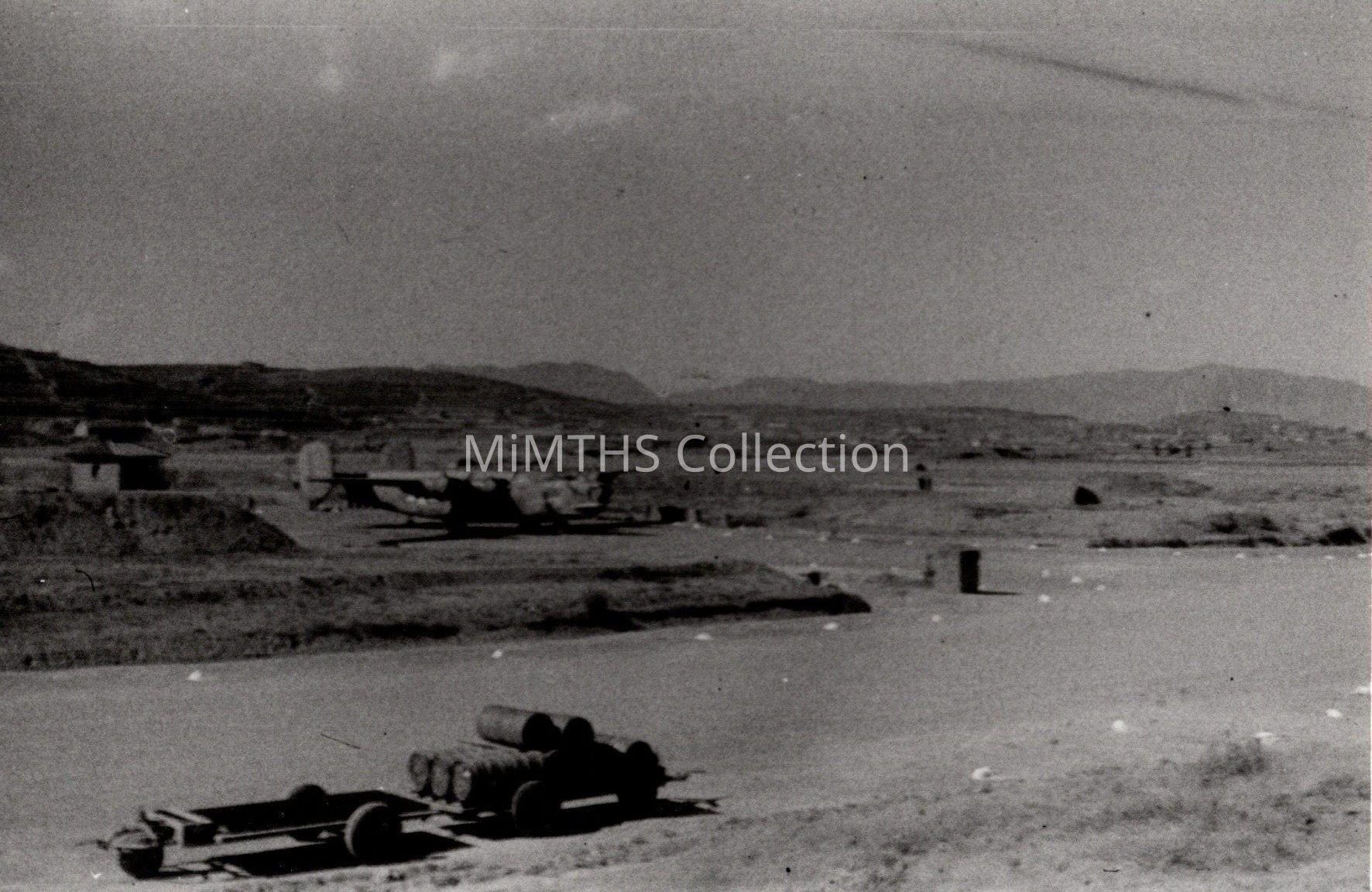 Modern inkjet photo of two M2 Chemical Trailers with a B-24 in the background.