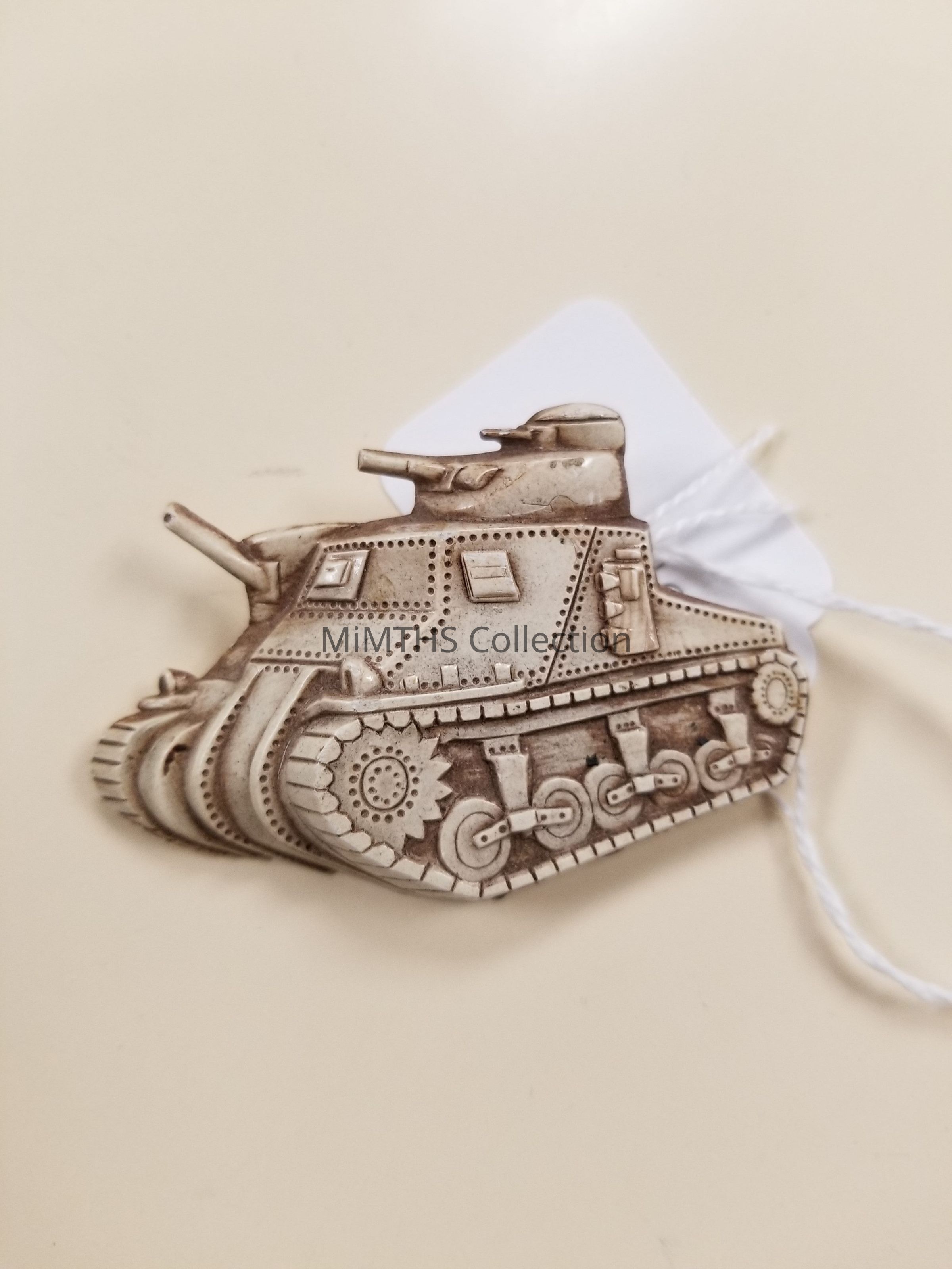 White plastic sweetheart pin in the shape of an M3 Lee Medium tankCataloged By