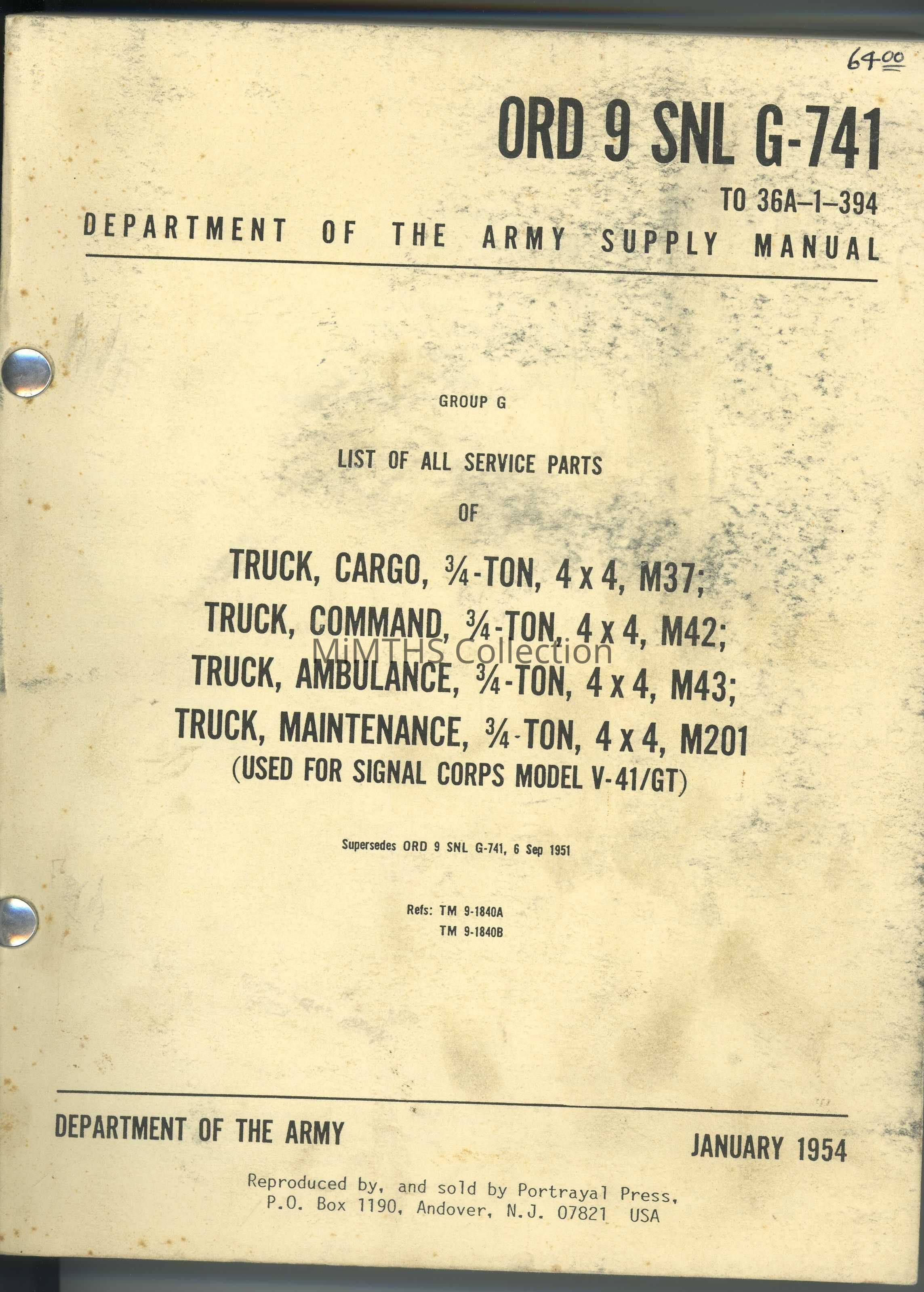 Group G List of all service parts of Truck, Cargo, 3/4-Ton, 4x4, M37 cargo, M42 Command, Ambulance M43, M201 maintenance (signal corps model V-41/GT)