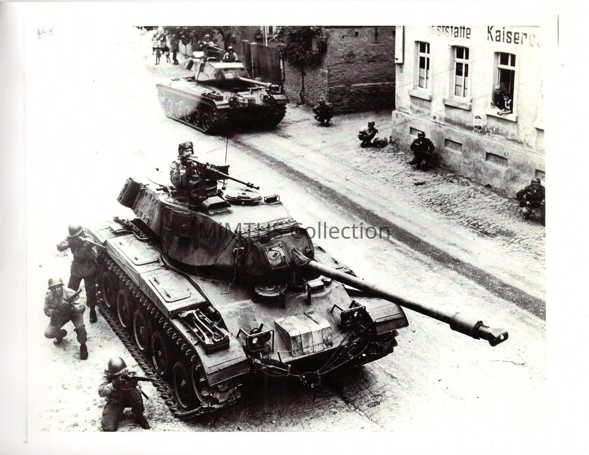 These M41s with US troops are taking part in a training exercise in an European town in the 1950’s. Note the wooden blocks stored on the front hull which were used to prevent the tank from rolling when parked.Cataloged By