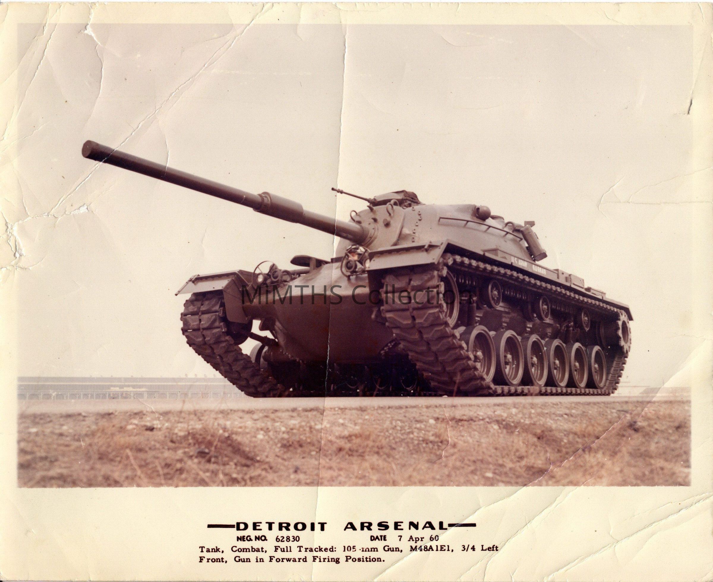 Color Glossy photo of the M48A1E1 taken at the Detroit Arsenal 3/4 left front with gun in forward firing position.