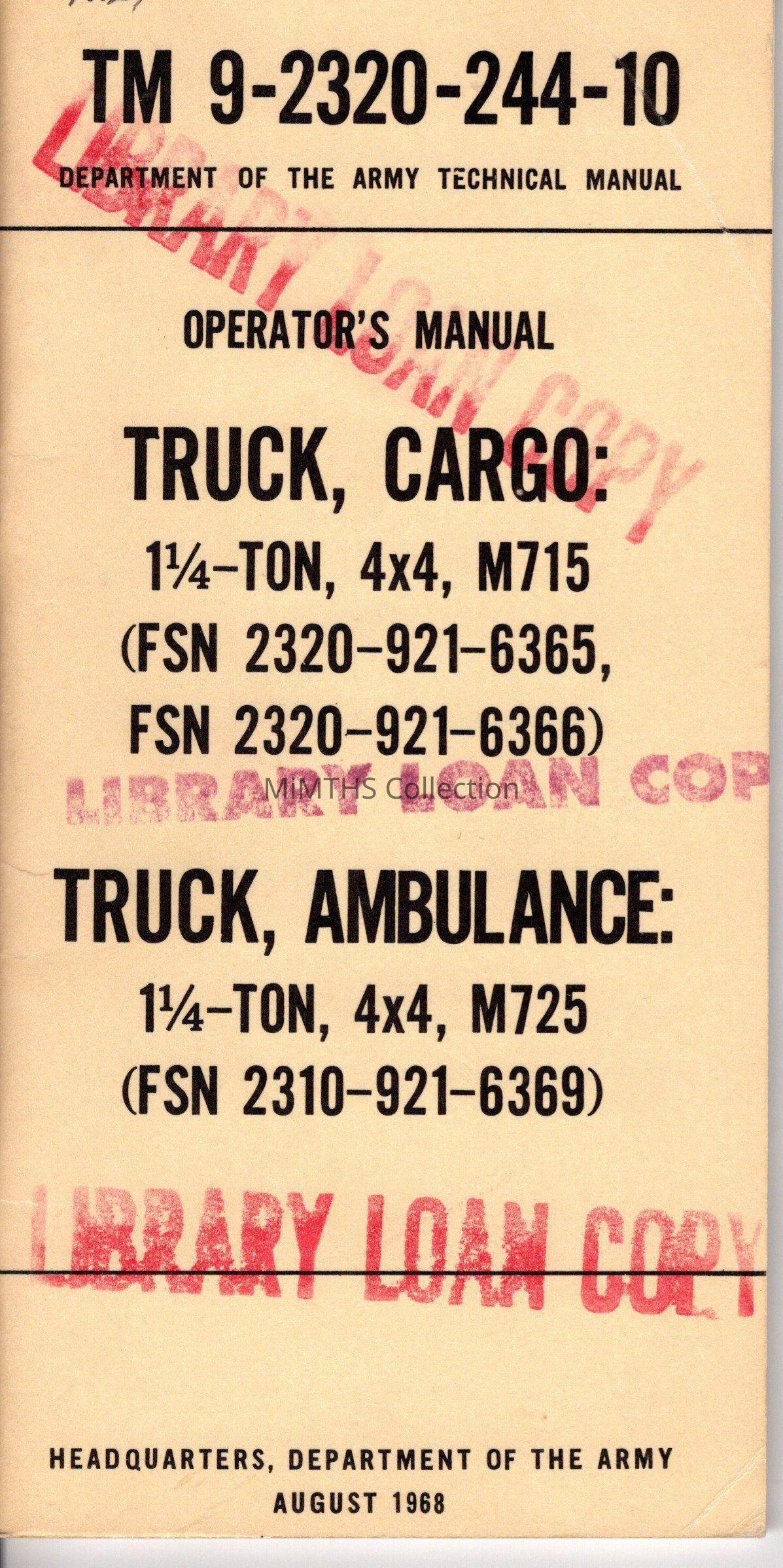 TM 9-2320-244-10 Operator's Manual, Truck, Cargo: 1 1/4-Ton, 4x4, M715 (FSN 2320-921-6365), et al, HQ, Department of the ArmyCataloged By