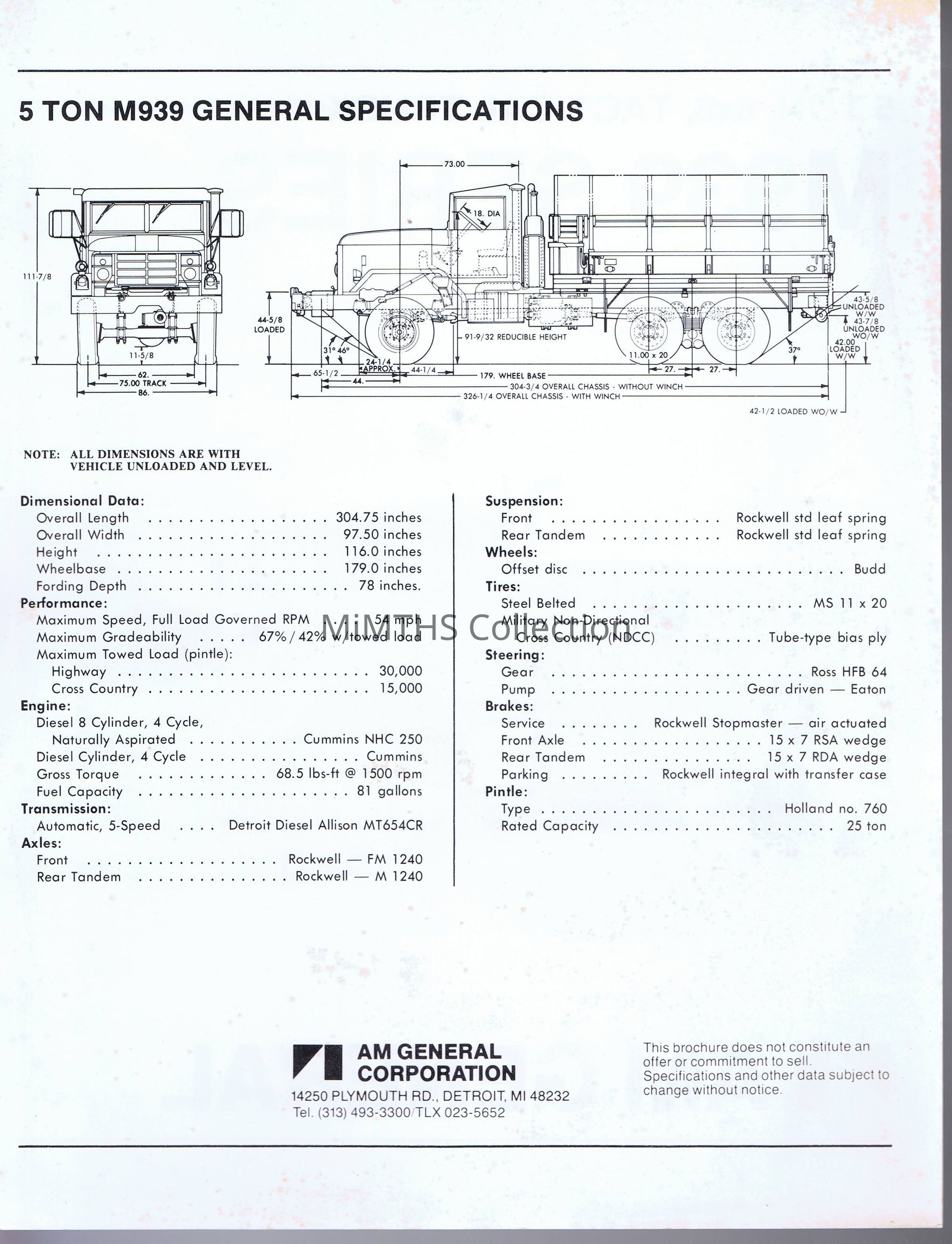 M939 Series, 5 Ton, 6X6, Tactical Truck, AM General informational sheetCataloged By