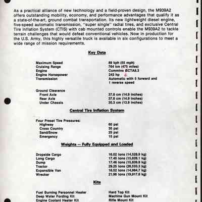 Binder of data sheets on the M939A2 series of 5-Ton Tactical Trucks. Contains sheets from TACOM and BMY. Appears to focus on the models produced by BMY.Cataloged By