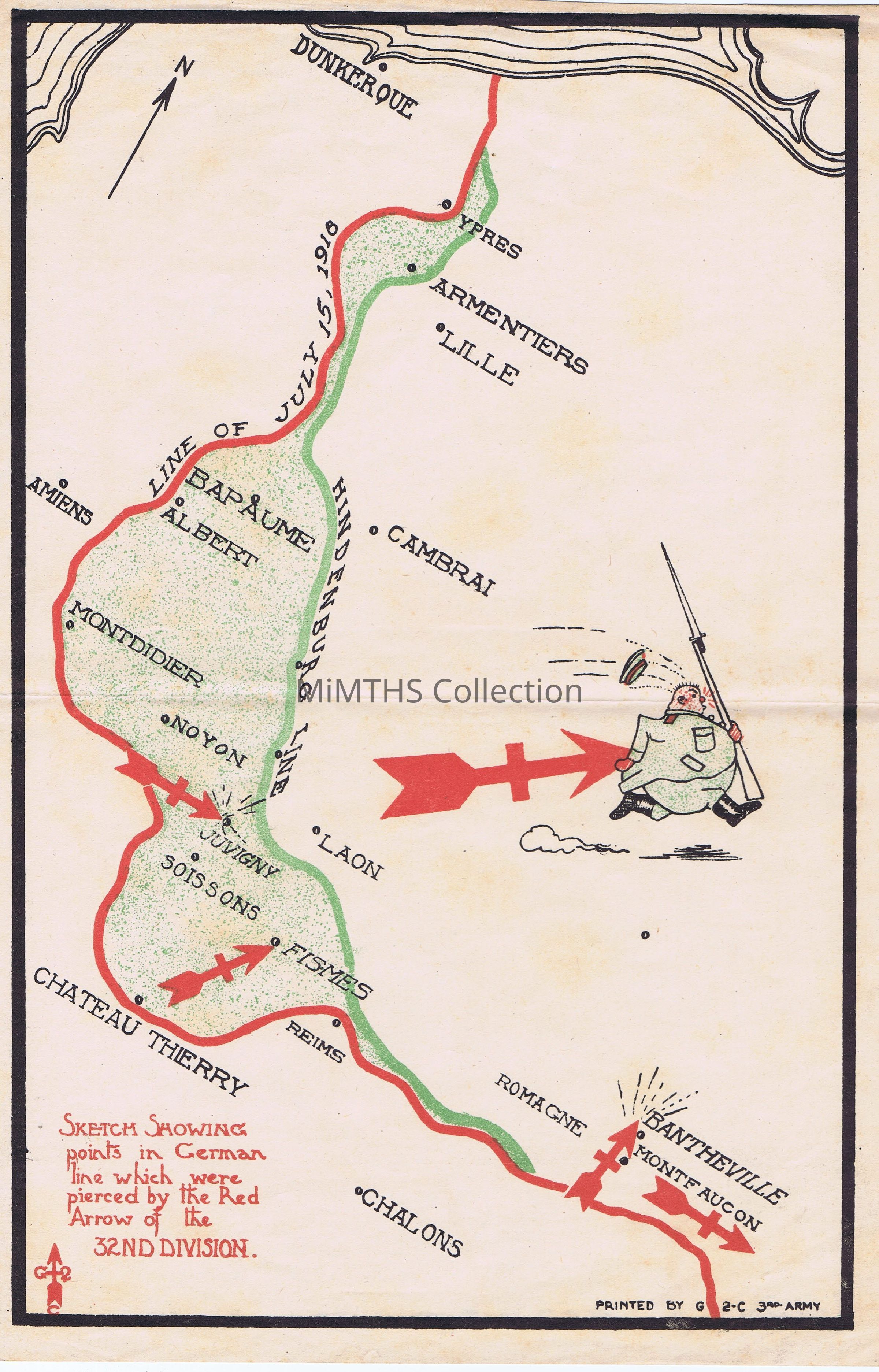 Sketch showing points in 1918 German line which were pierced by the 32nd Division which is illustrated as red arrows.Cataloged By