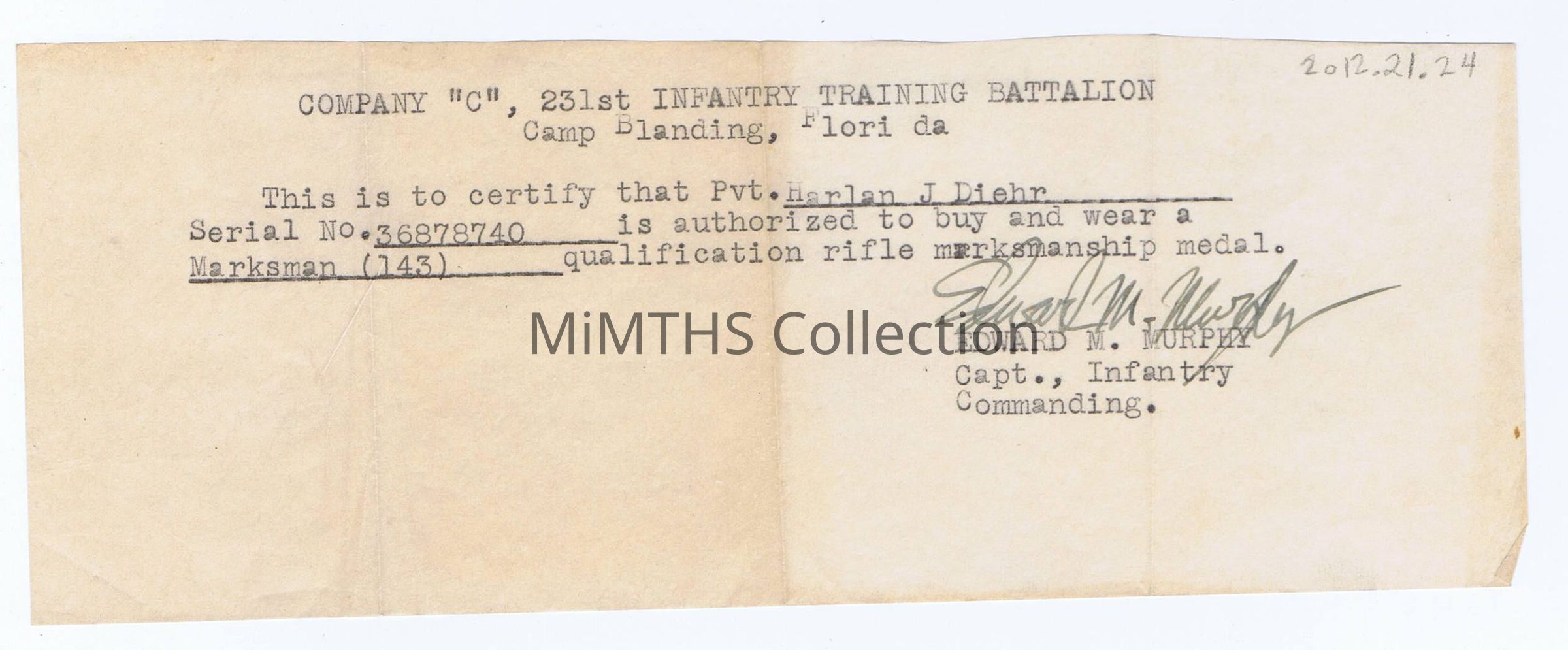 Crude cut paper slip certifying then Private Harlan J Diehr 36878740 "is authorized to buy and wear a Marksman (143) qualification rifle medal." Signed Captain Edward M. Murphy. Camp Blanding, Florida.Cataloged By