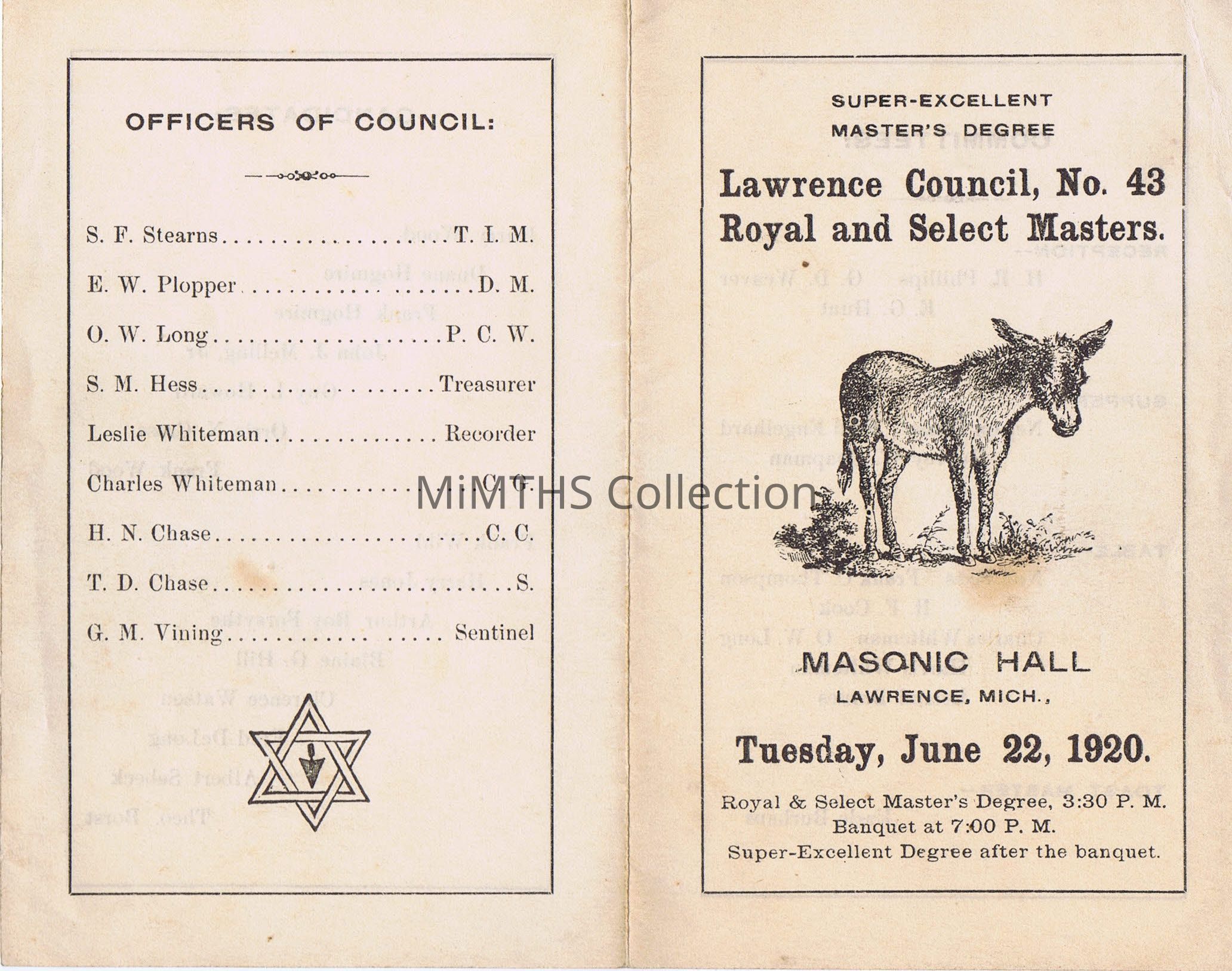 3x5 bifold for degree work, lists canidates name for master's Degree at the Lawrence Counccil No.43 Lodge, lawrence Michigan. From the Watson ccollection.Cataloged By