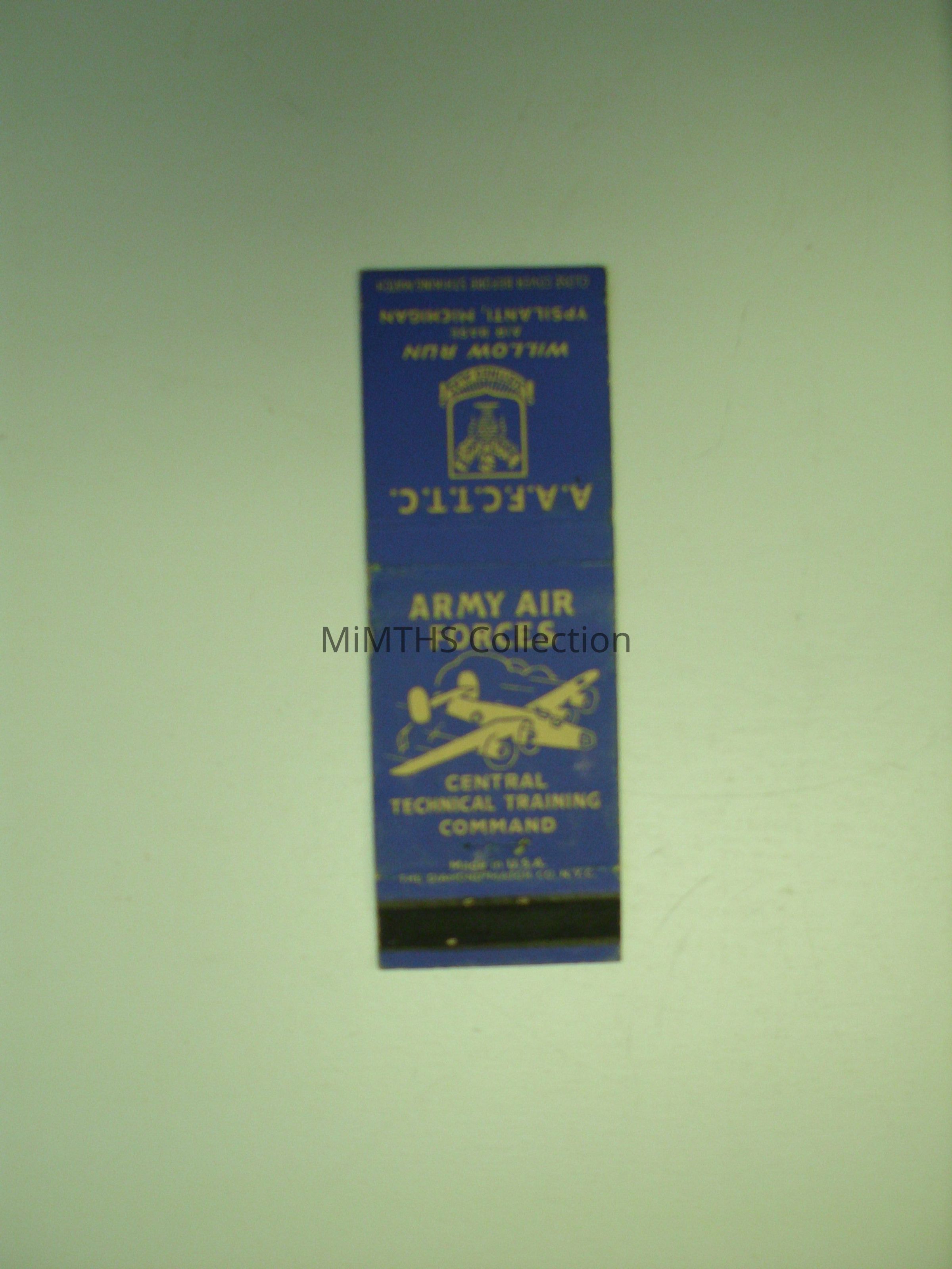 1 blue matchbook cover from the Army Air Forces Central Technical Training Command A.A.F.C.T.T.C at Willow Run Air Base, Ypsilanti, MichiganAcquisition