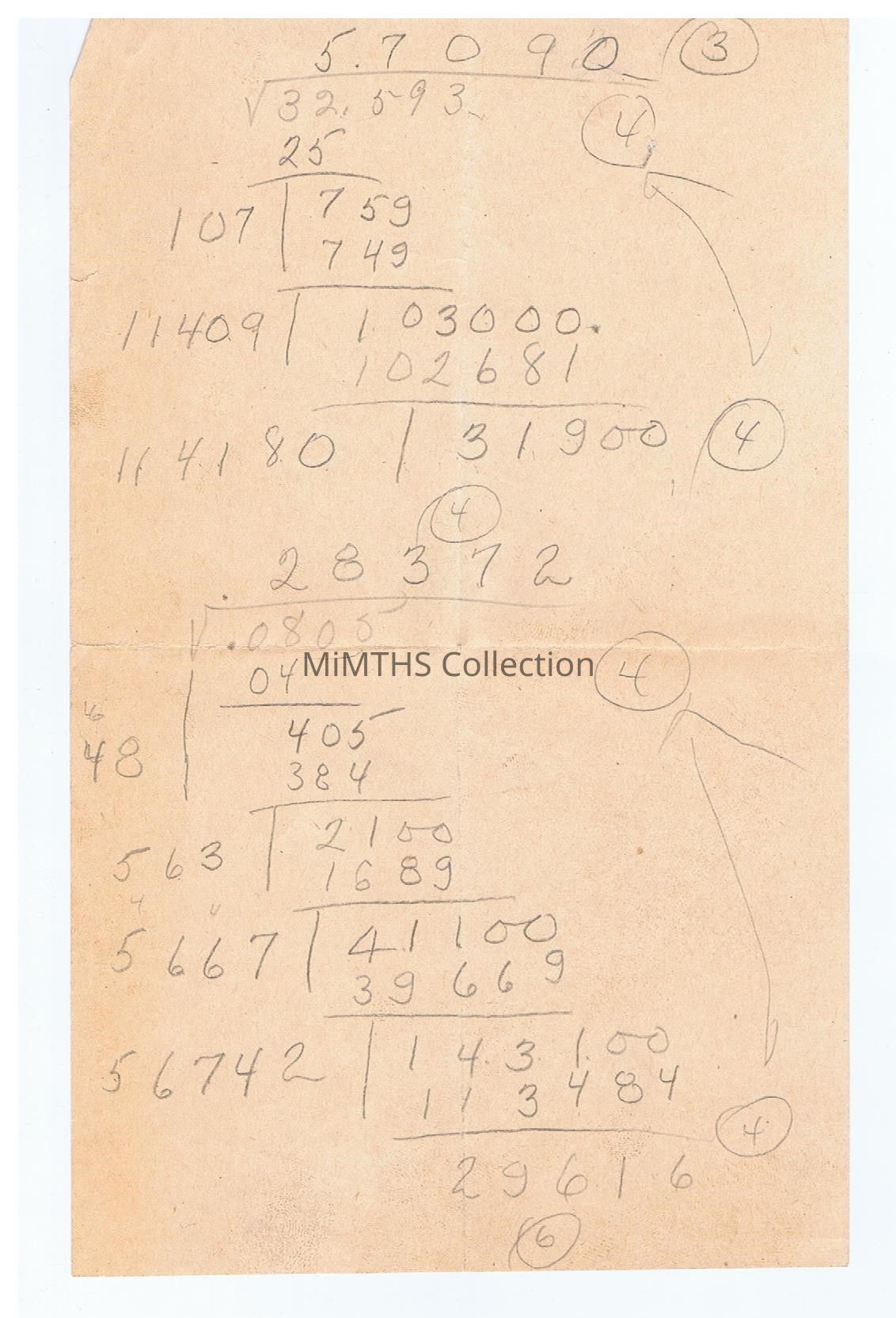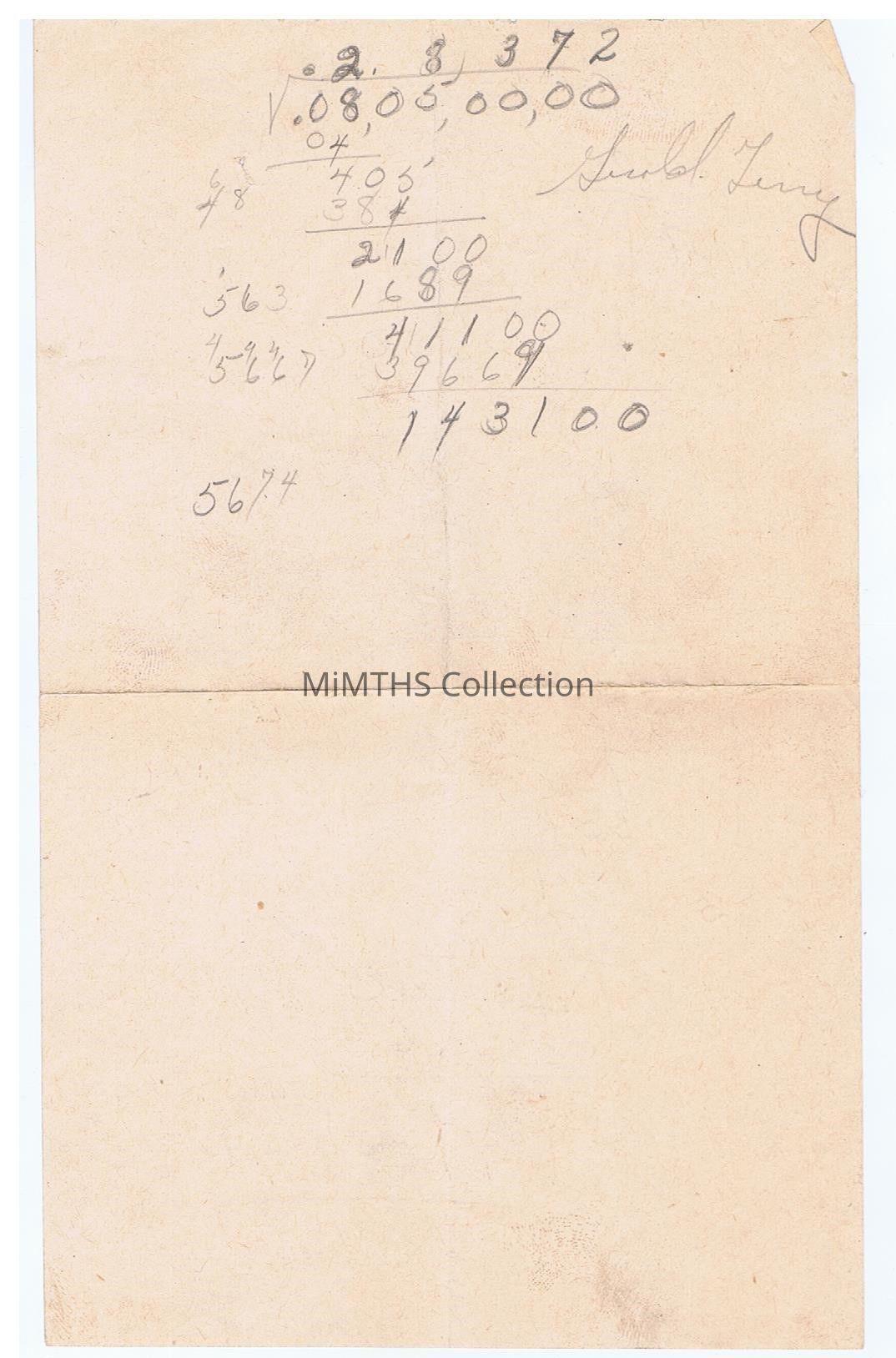 Page with hand written long division, was inside 2017.21.2, also named to Gerald Terry, badge # W1956Cataloged By