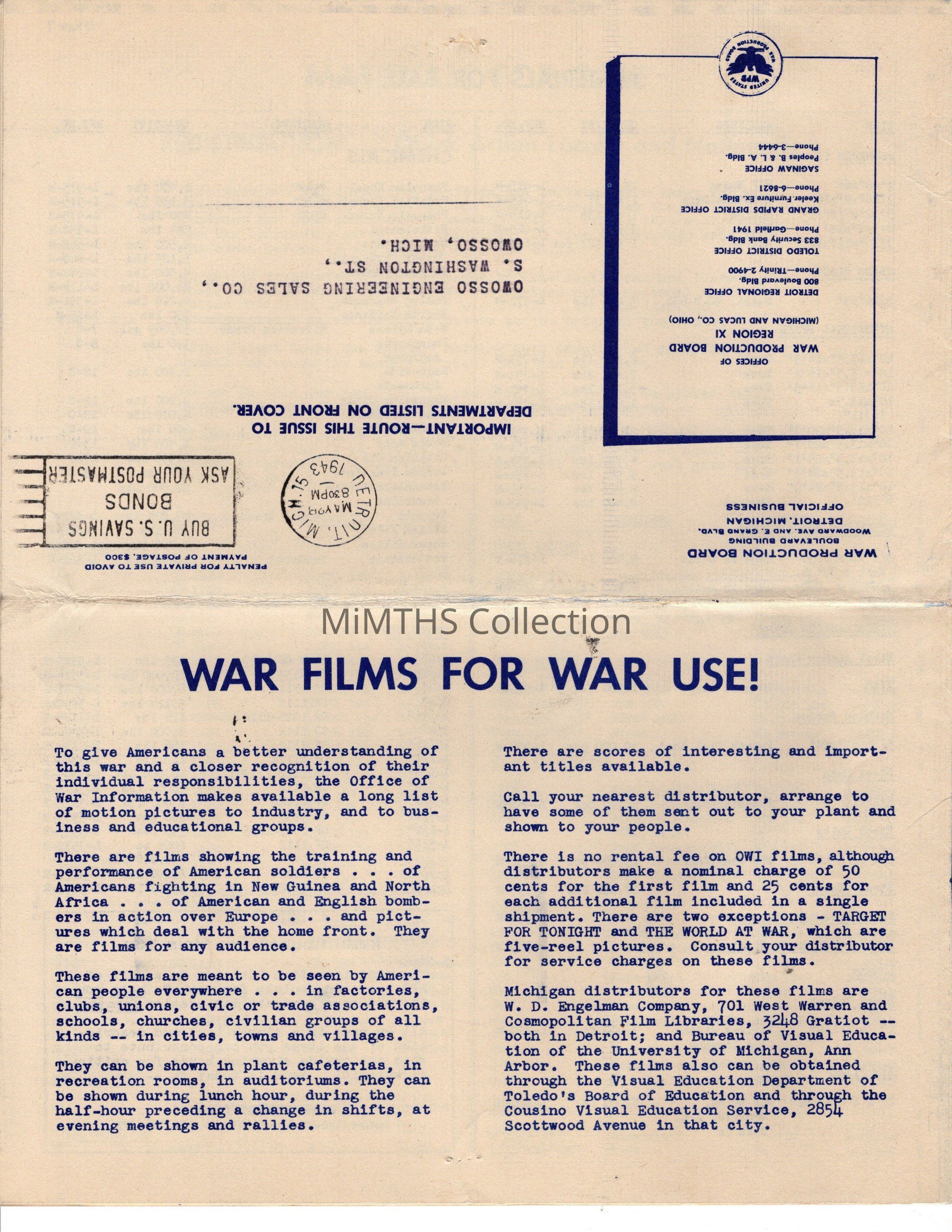 Addressed to Owosso Engineering Sales Co. located on S. Washington in Owosso.