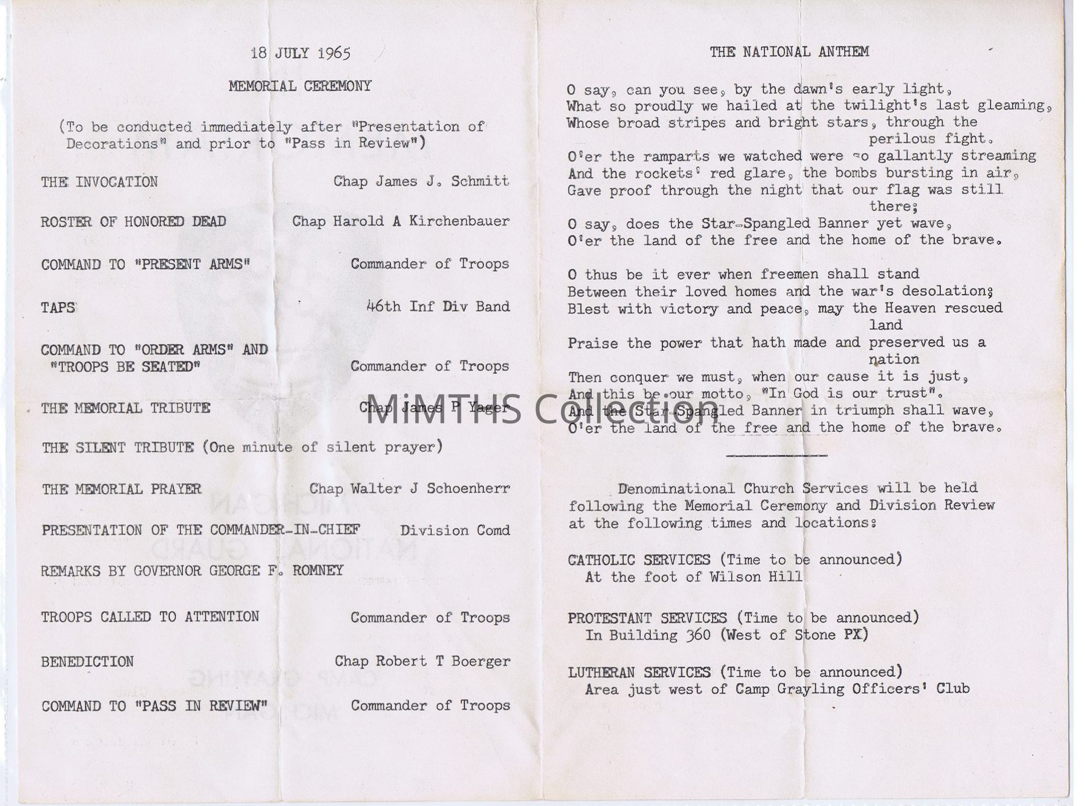 Memorial Program, Camp Grayling, 1965Entry/Object ID