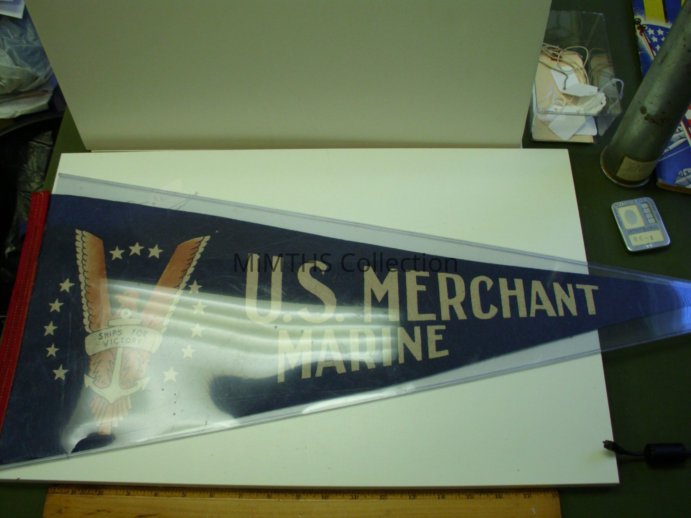 Blue felt merchant marine pennant with "V for Victory" motif.Cataloged By