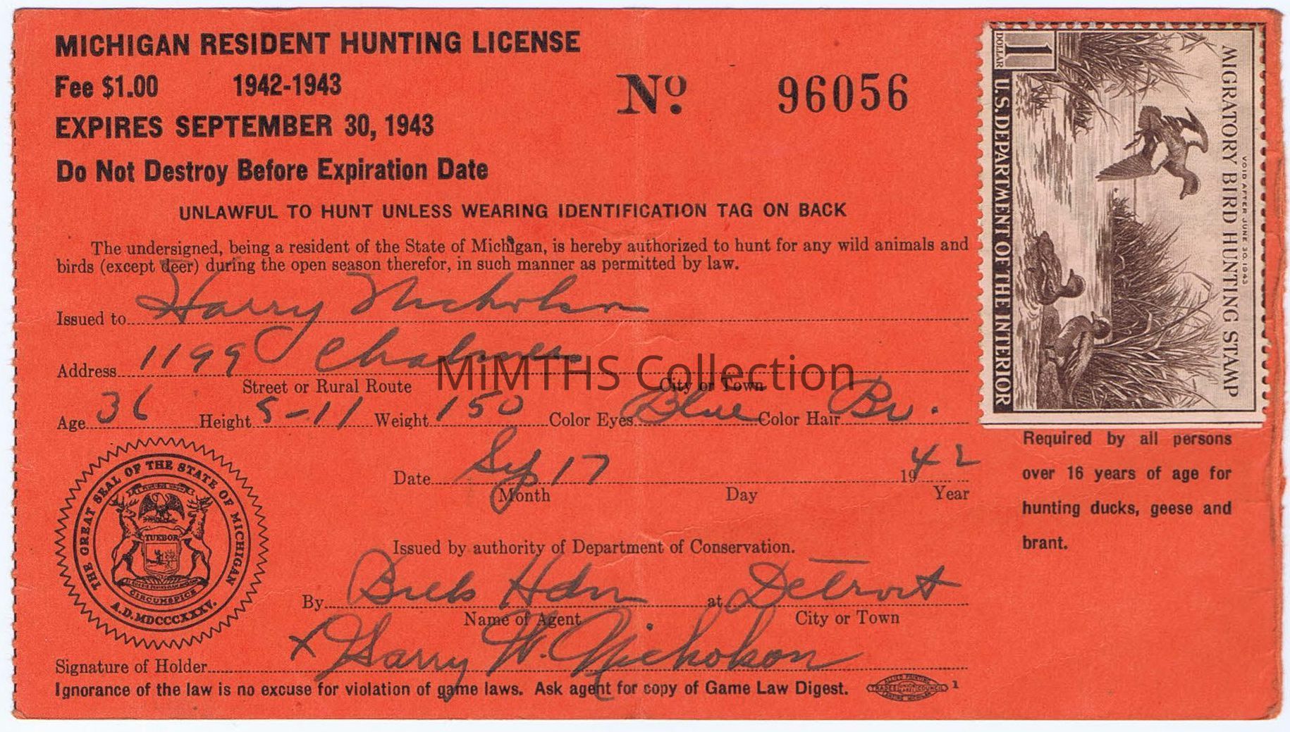 1942-43 Migratory Bird hunting License made out to Harry Nicholson, 1195 Chalmers, Detroit.