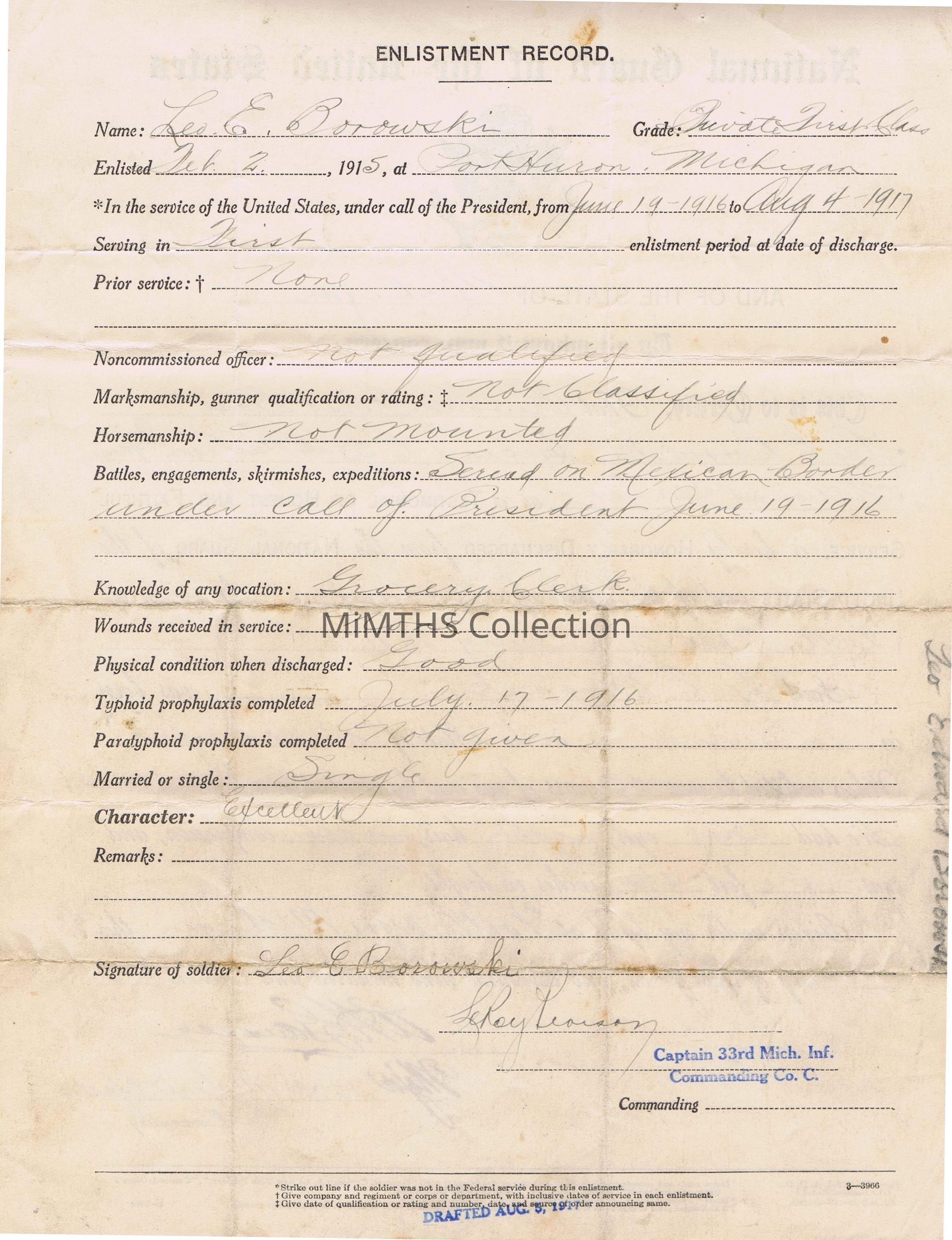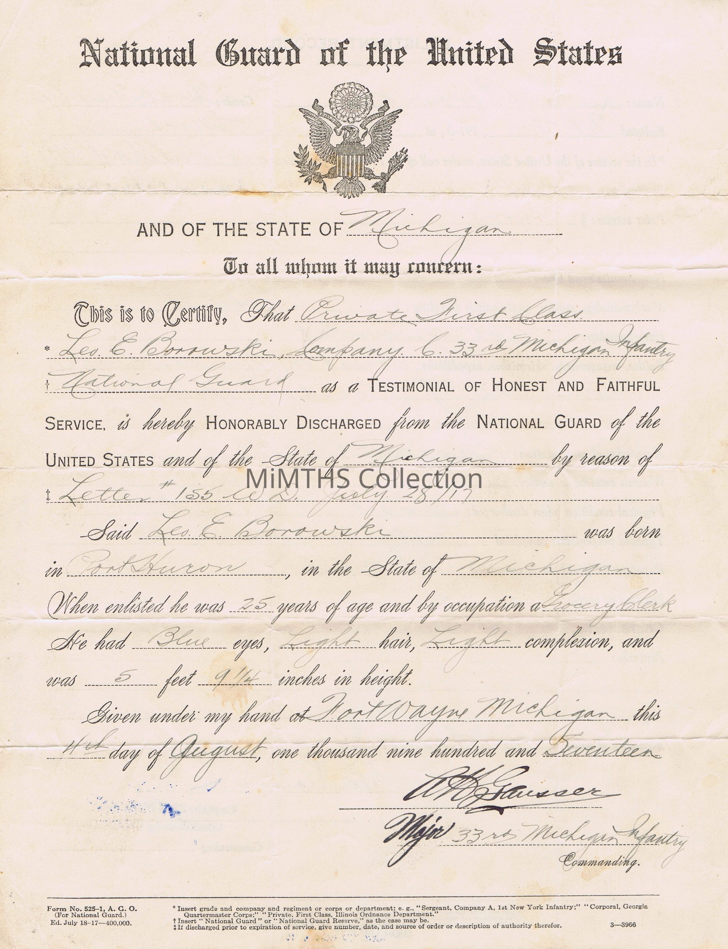 Form discharging Private Leo Borowski from the Michigan National Guard, 4 August, 1917.