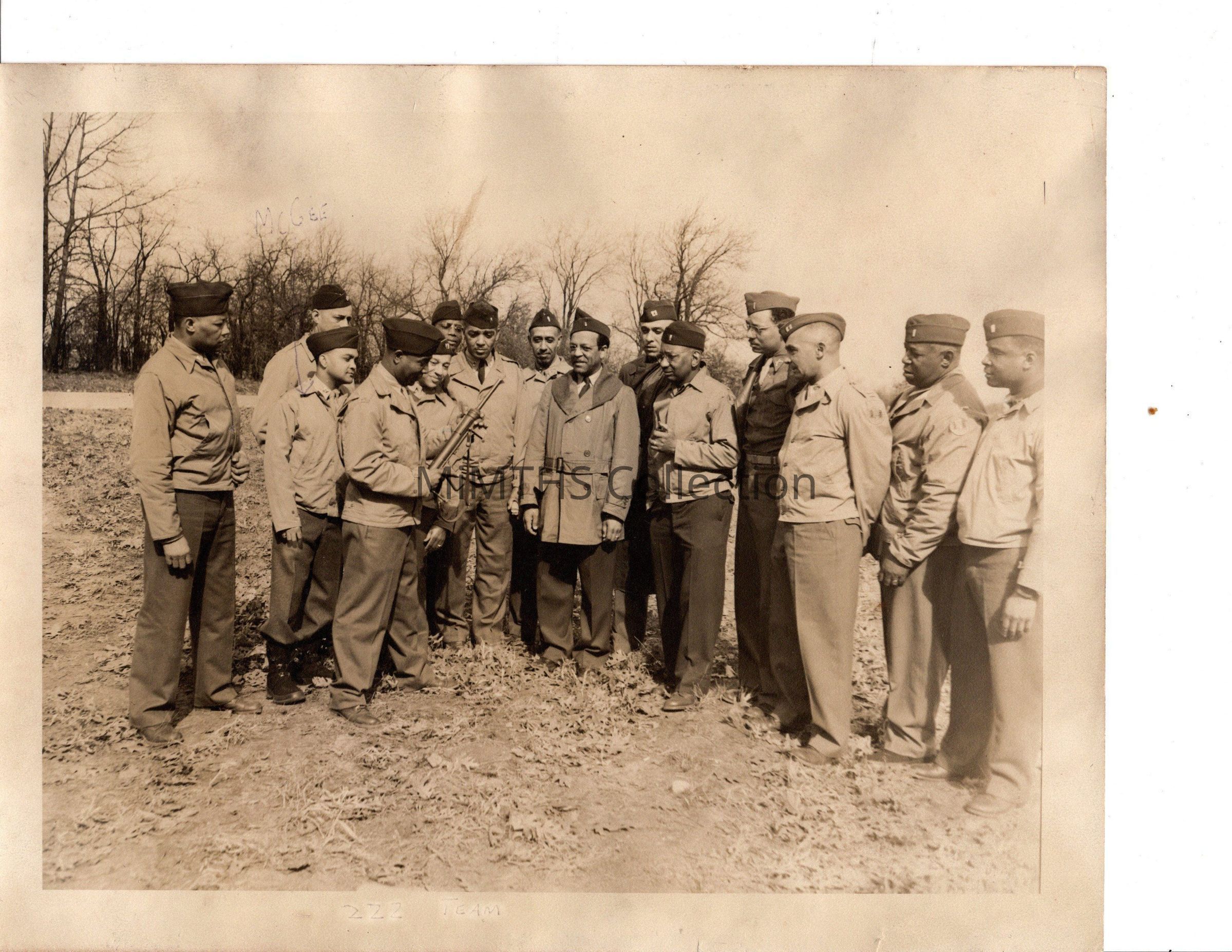 Period 8x10 black and white photo of Officers from the Michigan State Troops 2nd MP Bn. (colored) looking over an M-3 SMG (Grease Gun)Photograph Details