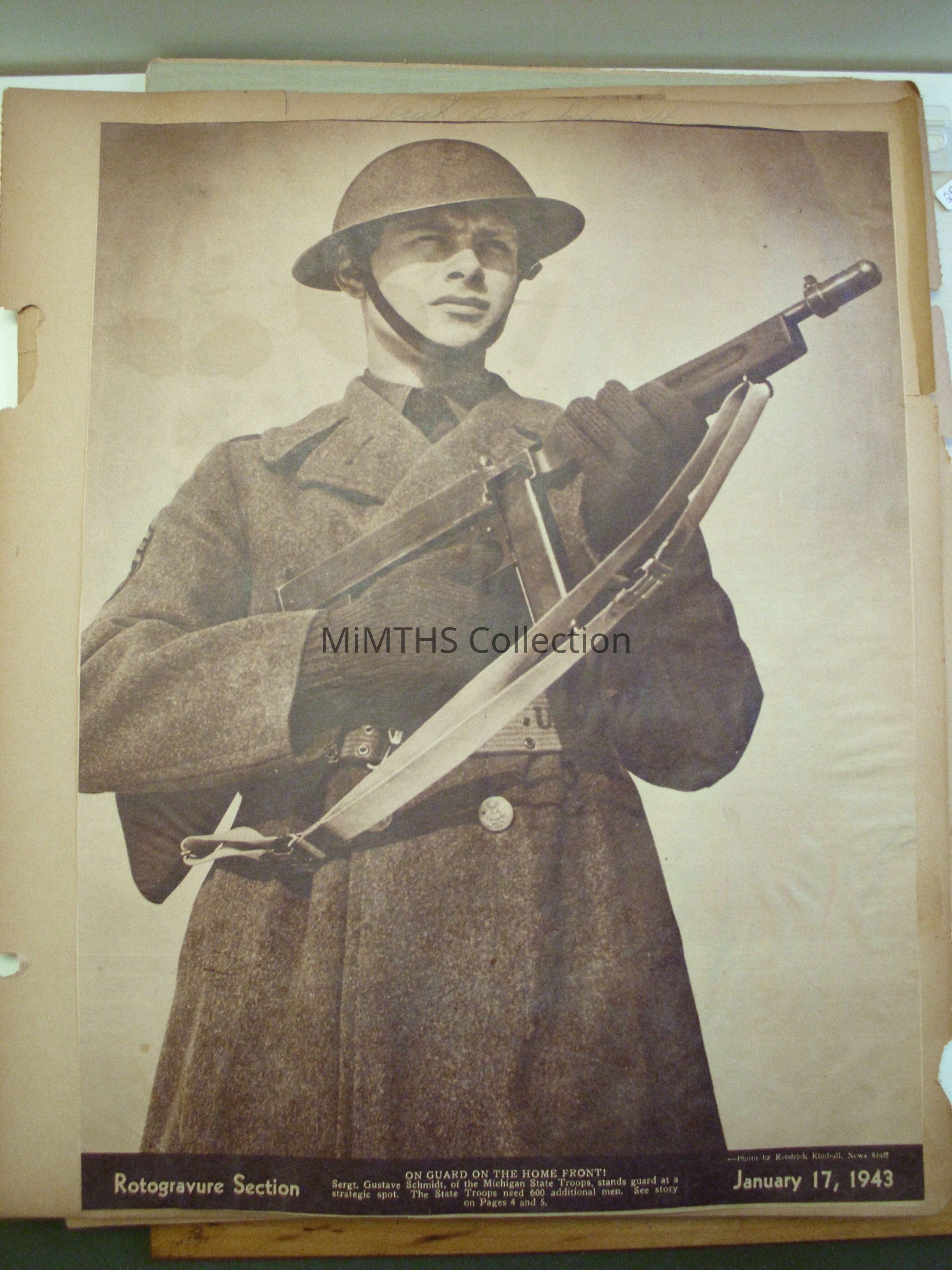 One side has a clipping from the Free Press Rotogravure section, January 17 1943 featuring MST Sgt. Gustave Schmidt holding an M1928 Thompson while "Standing Guard"