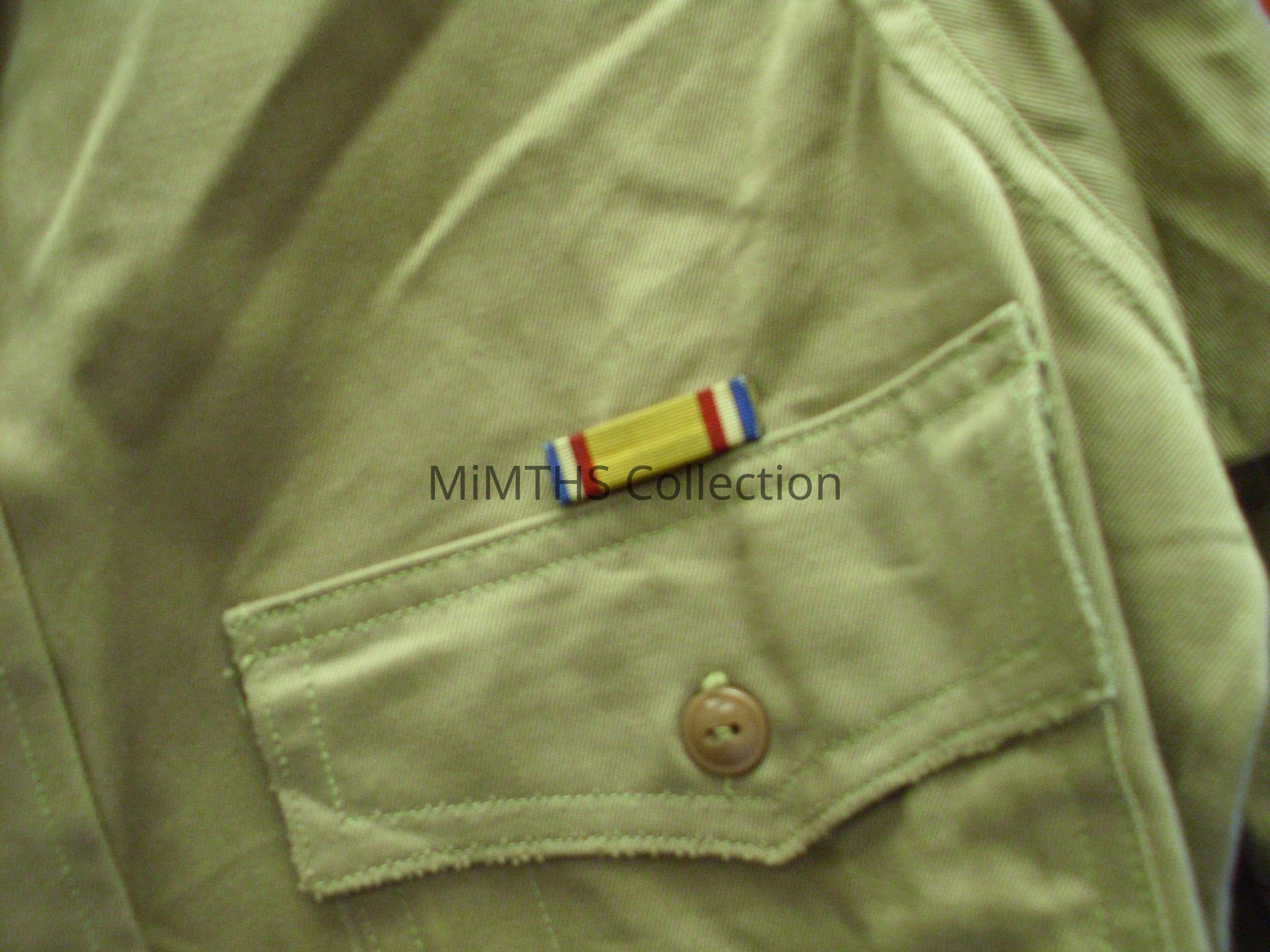 - Shirt, Men's Enlisted, Cotton Khaki shirt with MST shoulder patch and Post VJ-Day service ribbon.