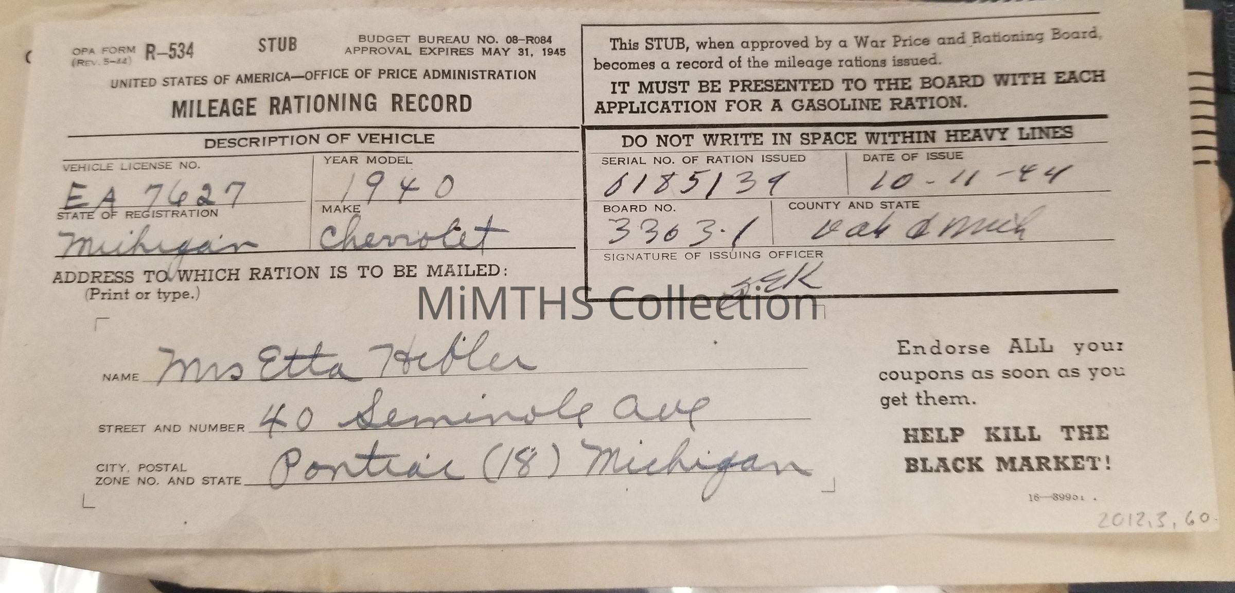 1 Mileage rationing record with envelope, made out to Mrs. Etta Hebler of Pontiac, MI She drove a 1940 Chevrolet.