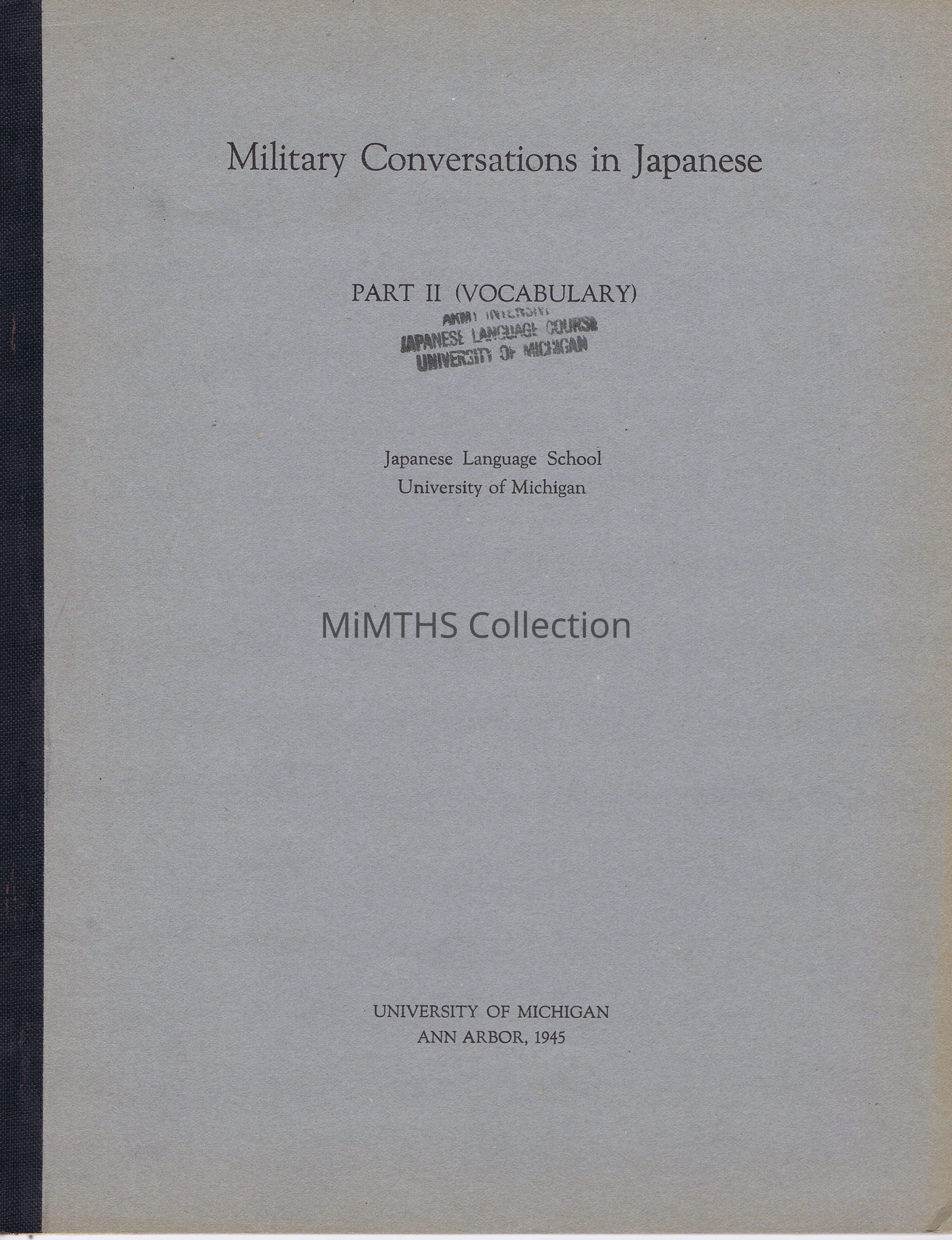 Booklet, Military Conversations in Japanese, Part II, Vovabulary. Published by the Japanese Language School, University of Michigan, Ann Arbor. 1945