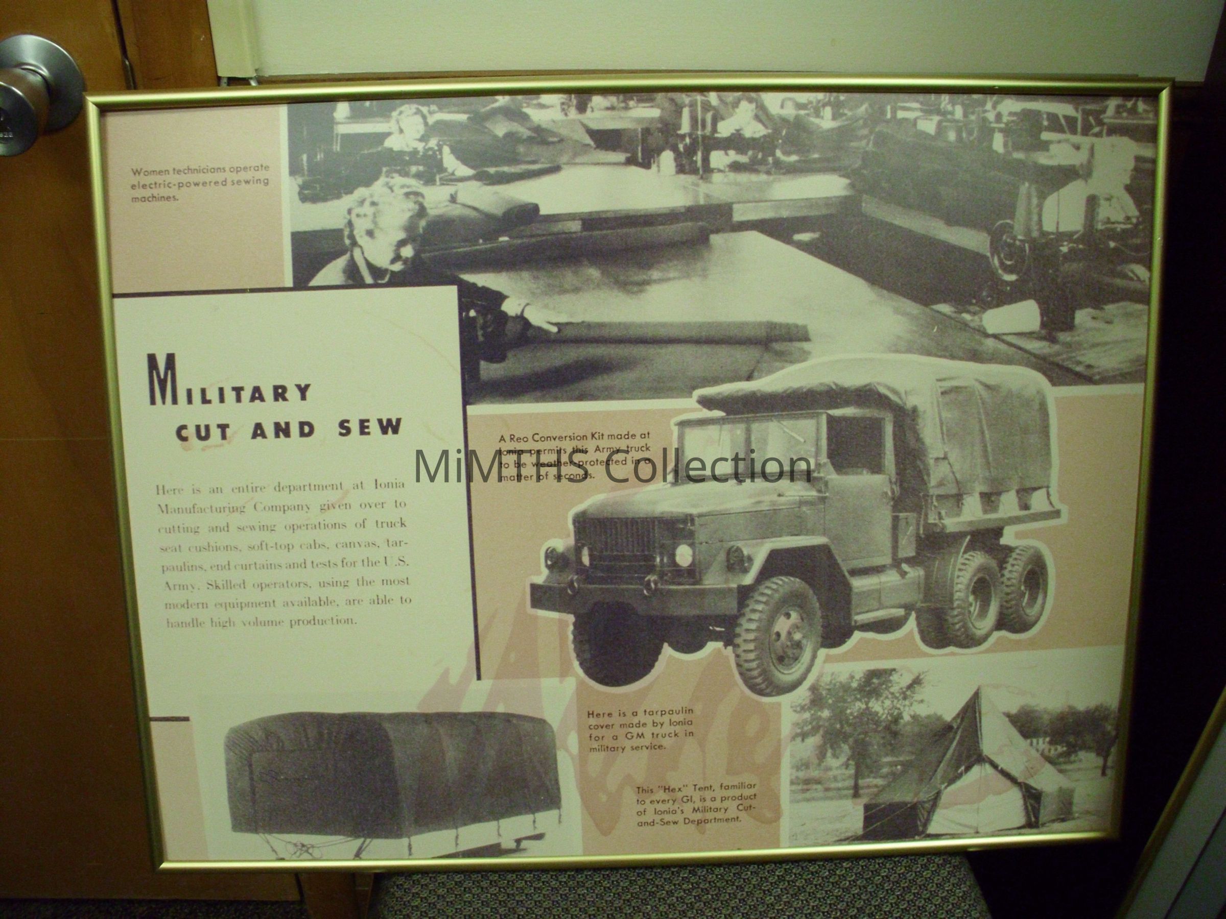 From the Mitchell Bentley Collection 26x20 info board on the item made by the Ionia Mfg Military Cut and Sew dept.