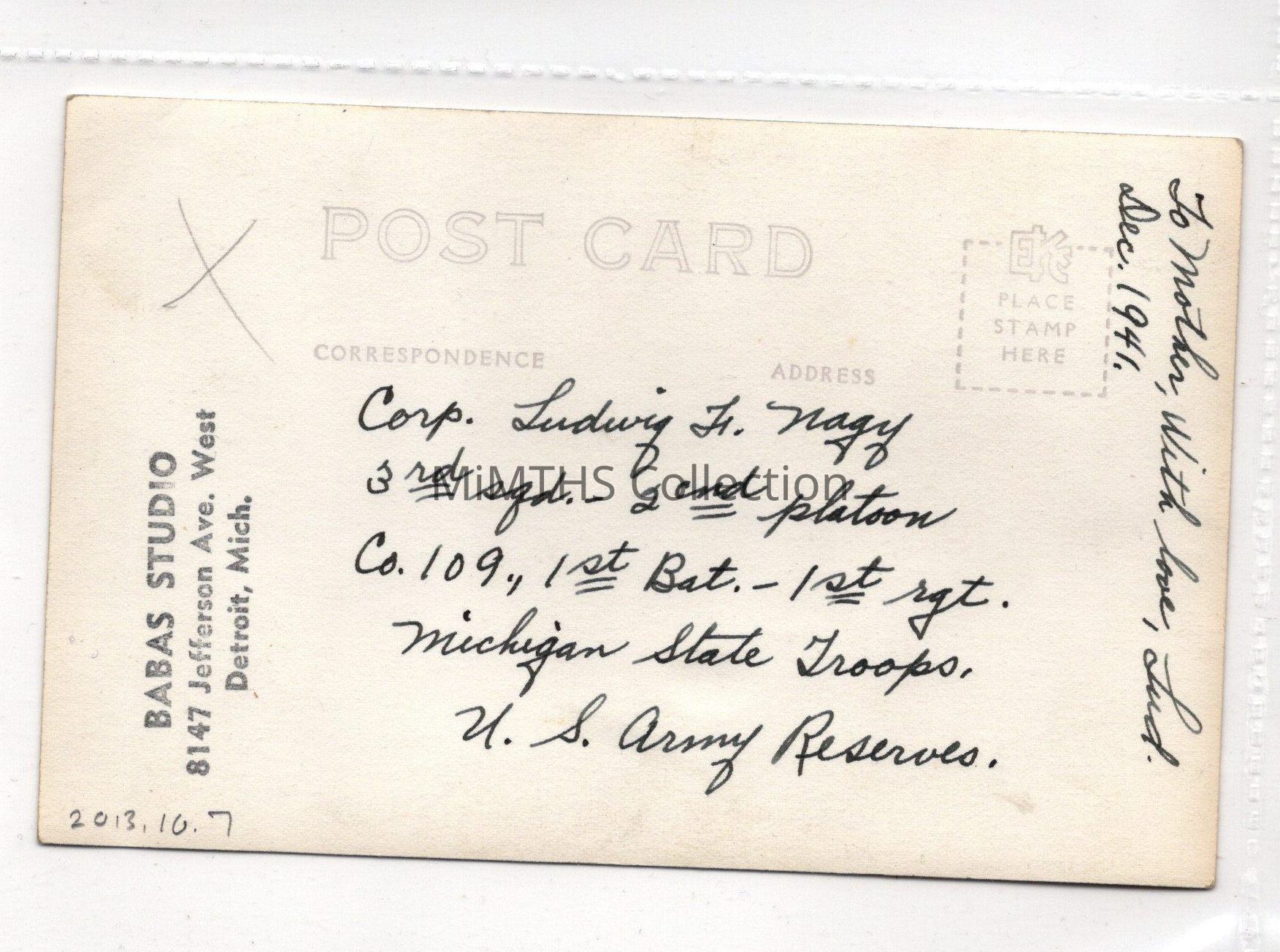 Photo of Corporal Ludwig F. Nagy, 3rd Squad, 2nd Platoon, Company 109, Michigan State Troops, Brush Street Armory, Detroit.