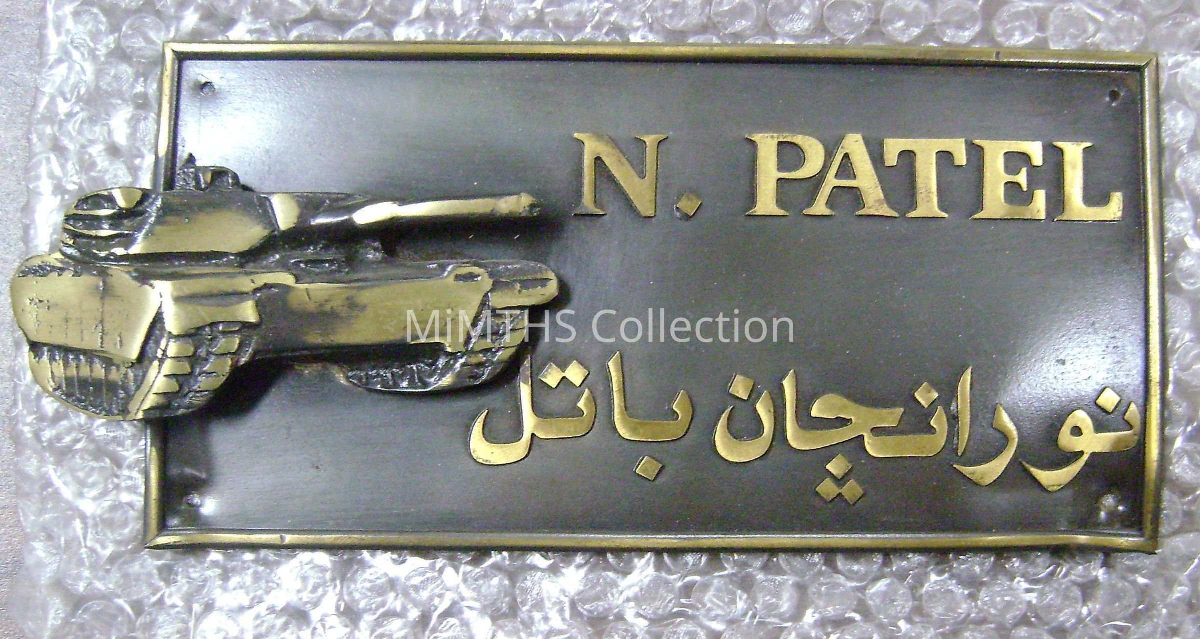 Name plate win N.Patel in English and Arabic with M1 Abrams motif.