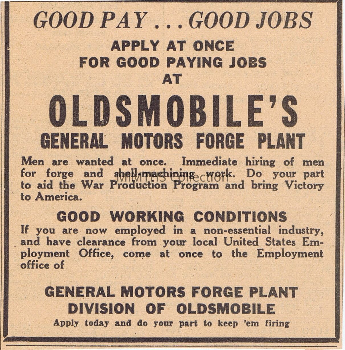 Ad clipped from a newspaper seeking men to work at the Oldsmobile Forge plant.Cataloged By