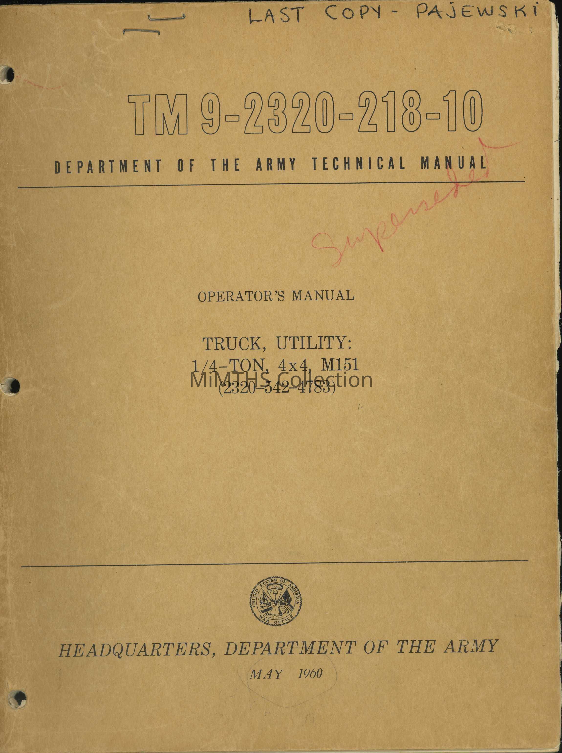 Operators Manual, Truck, Utility: 1/4 Ton, 4X4, M151 (2320-542-4783)Cataloged By