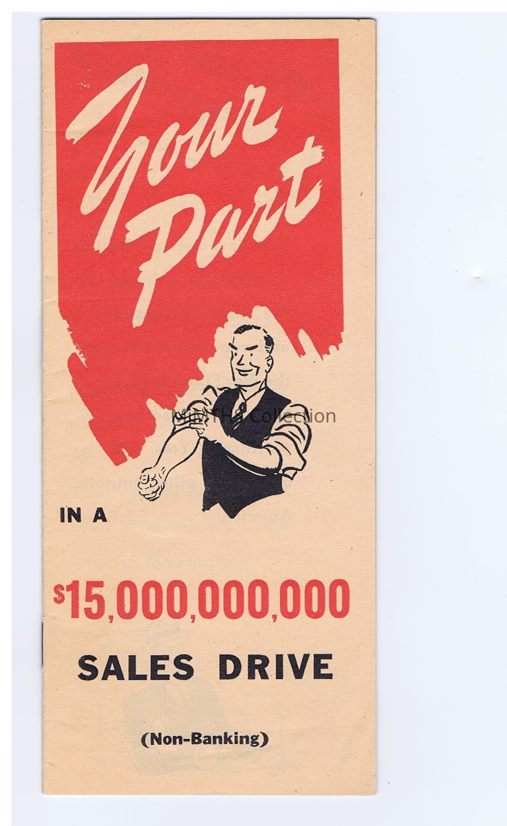 "our Part in a $15,000,000,000 Sales Drive 9non-banking)" Booklet instructions for selling war bonds. 3.5in x 7.5in date printed 1943. The title is kind of weird, they might have an "h" infront of "hour" or it could just be a squiggle for style.Cataloged By