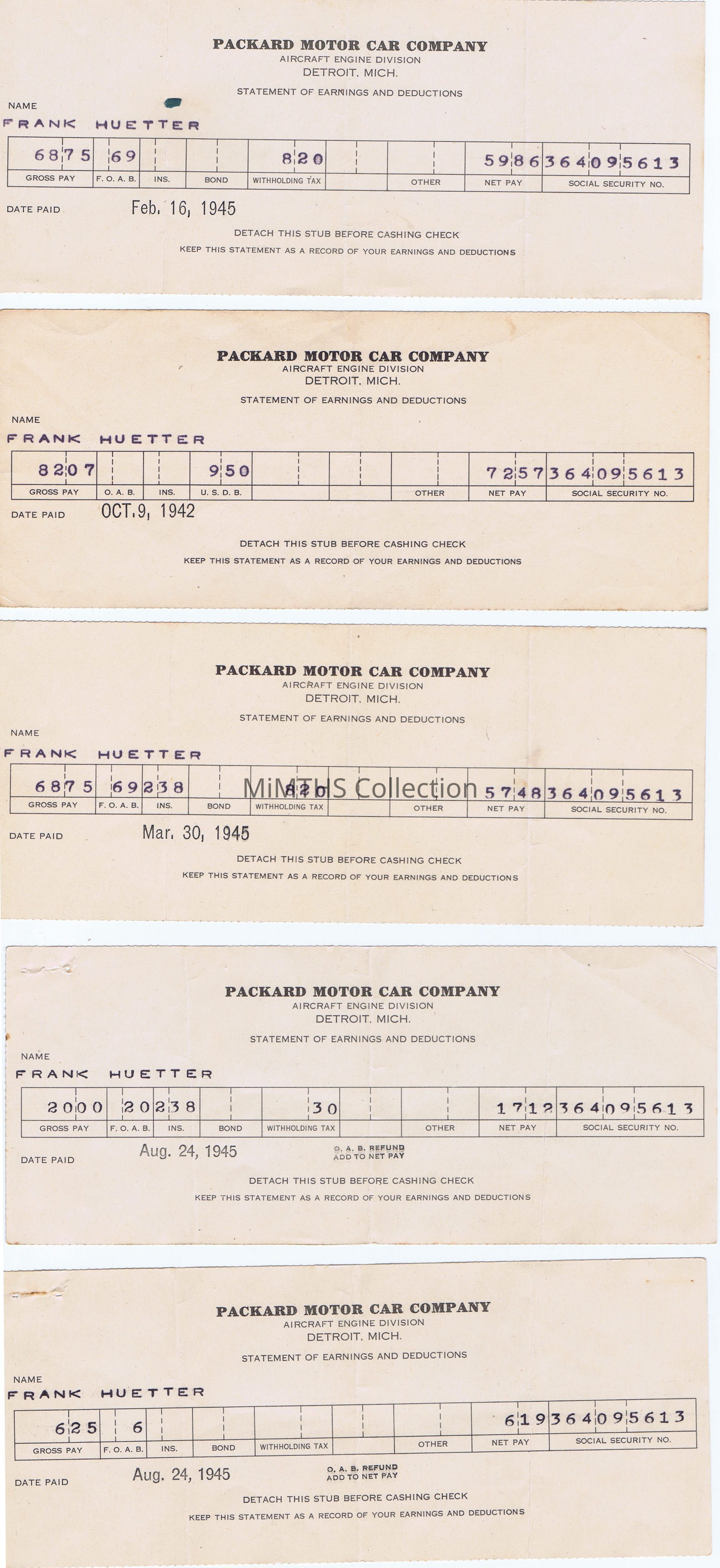 Packard Motor Car Company Aircraft Engine Divission Pay stub for Frank Huetter, Feb 16, 1945Cataloged By