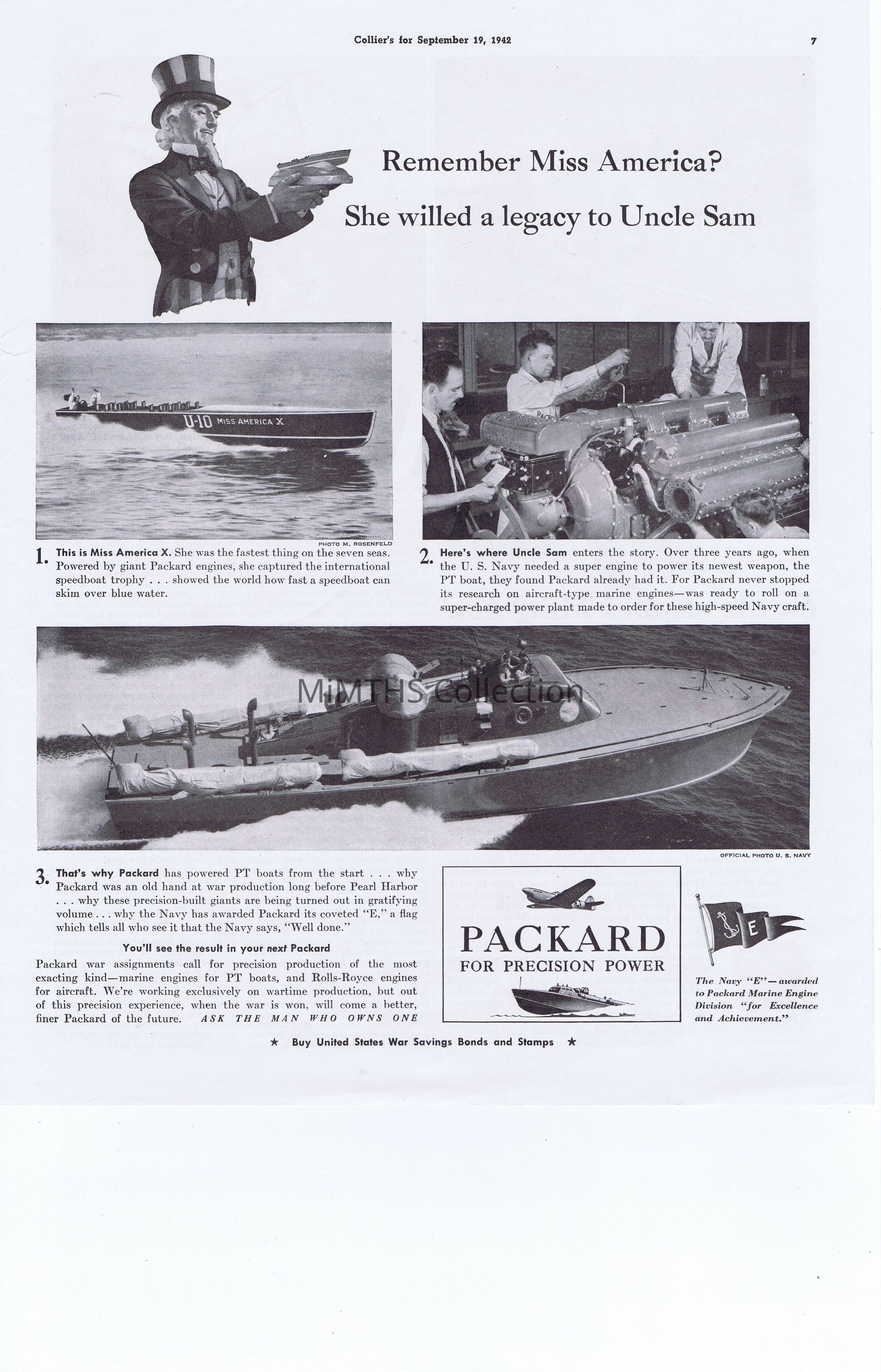 Packard ad from 1942 featuring the Gar Wood Miss America boat and PT boats "Remember Miss America? She willed a Legacy to Uncle Sam"