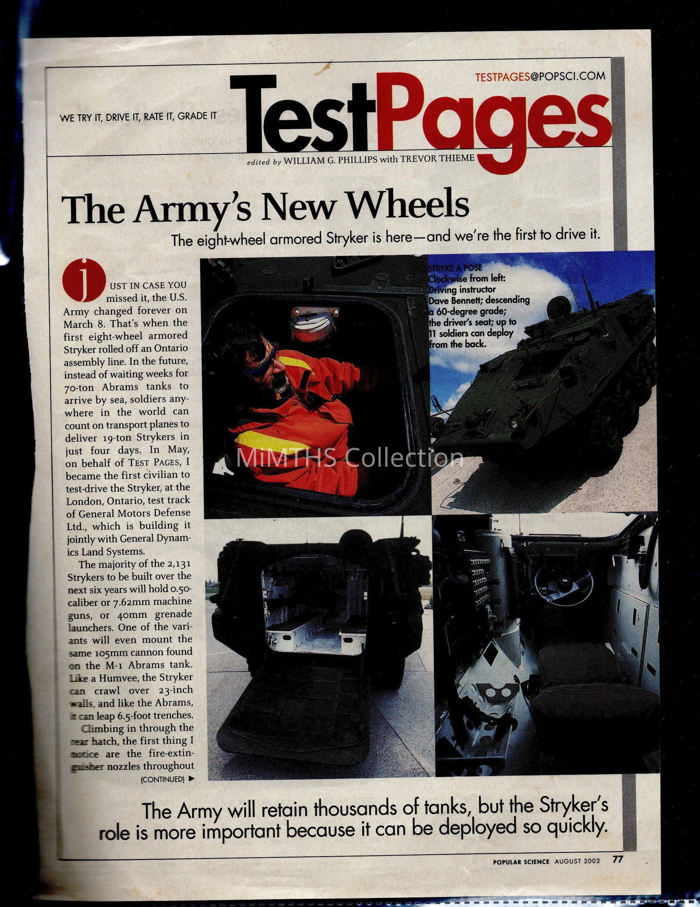 A page from a Aug. 2002 popular science magazine. Article is on the development of the Stryker APC.Cataloged By