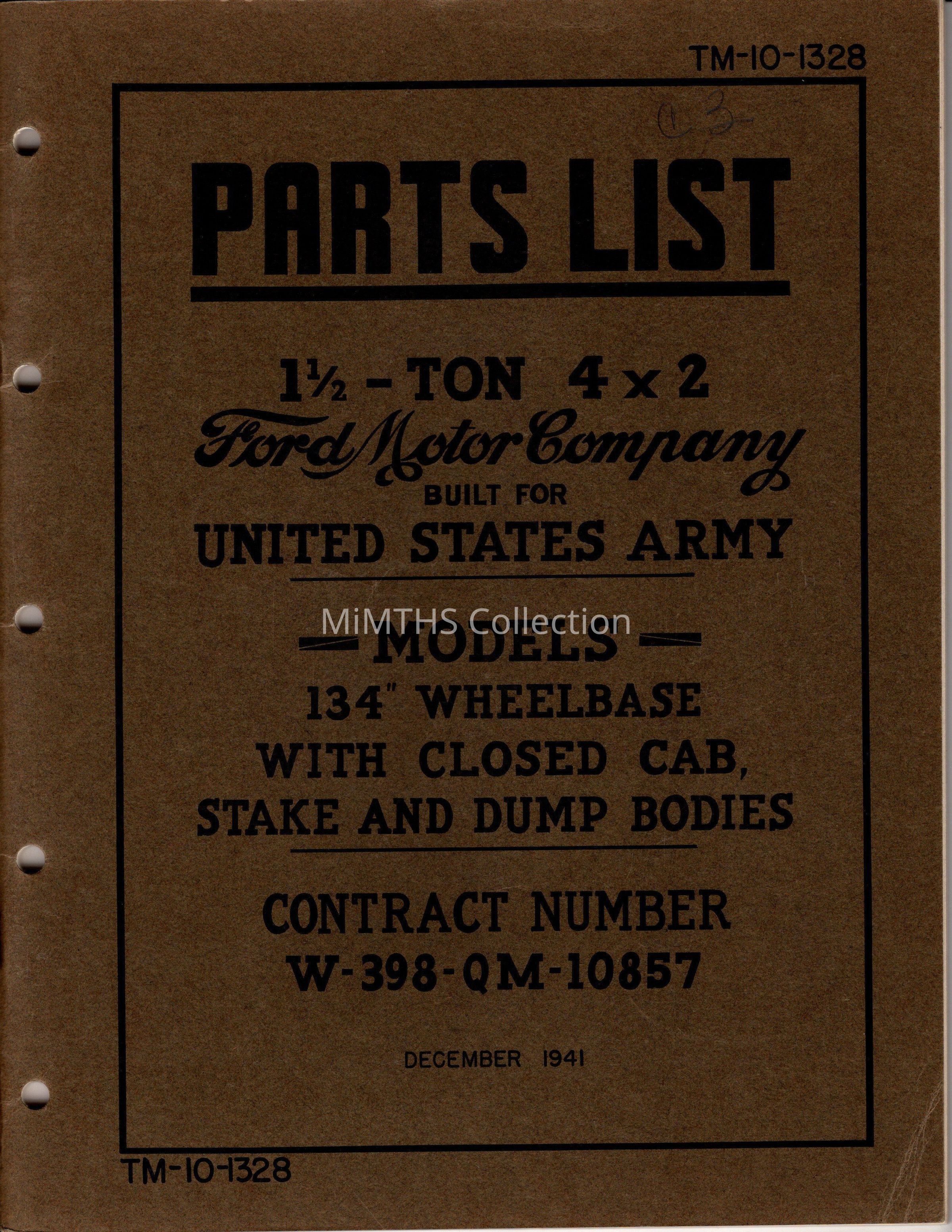 Parts List Ford 1-1/2 ton 4x2 built for United States Army, Models: 134" Wheelbase with closed cab, stake and dump bodies, Contract Number W-398-QM-10857Cataloged By