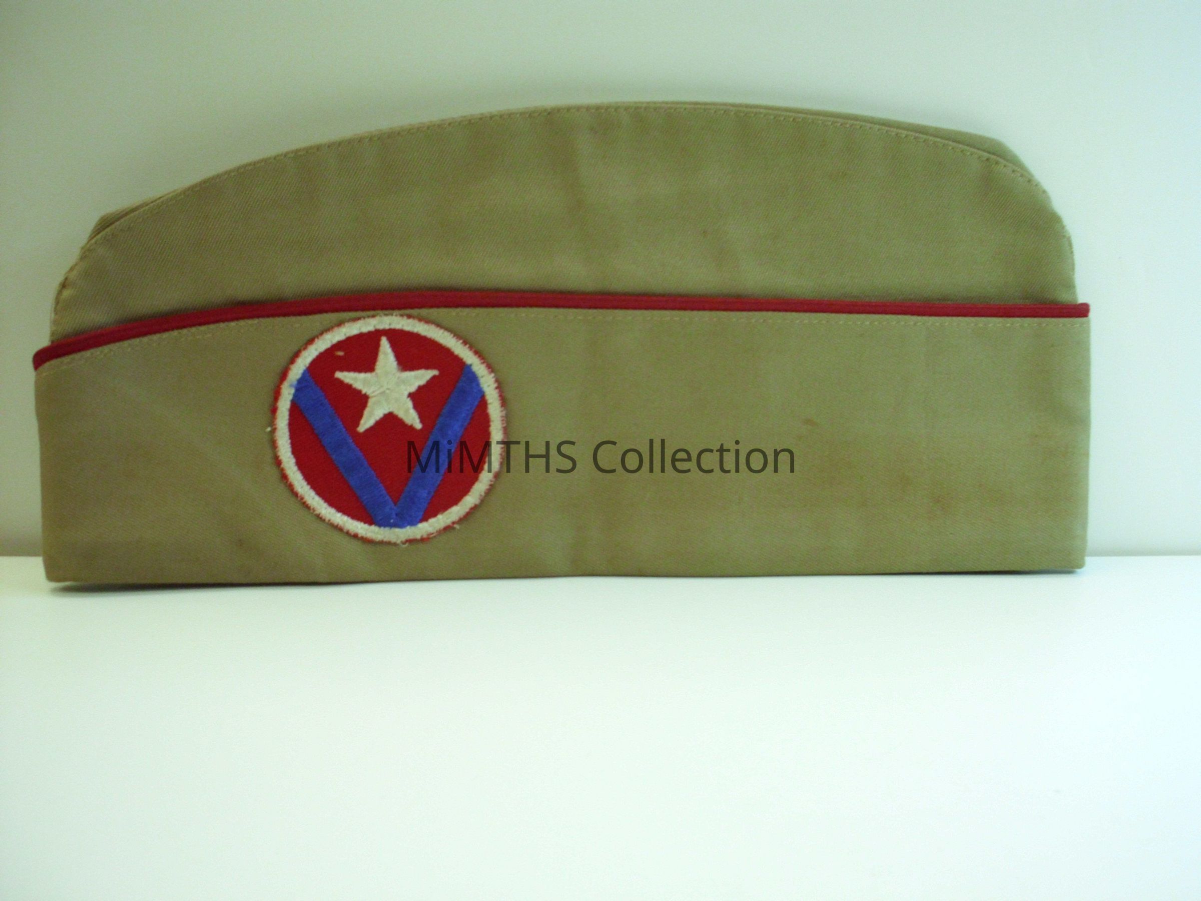 7 3/8 size tan with round patch, red, with blue V and white star.