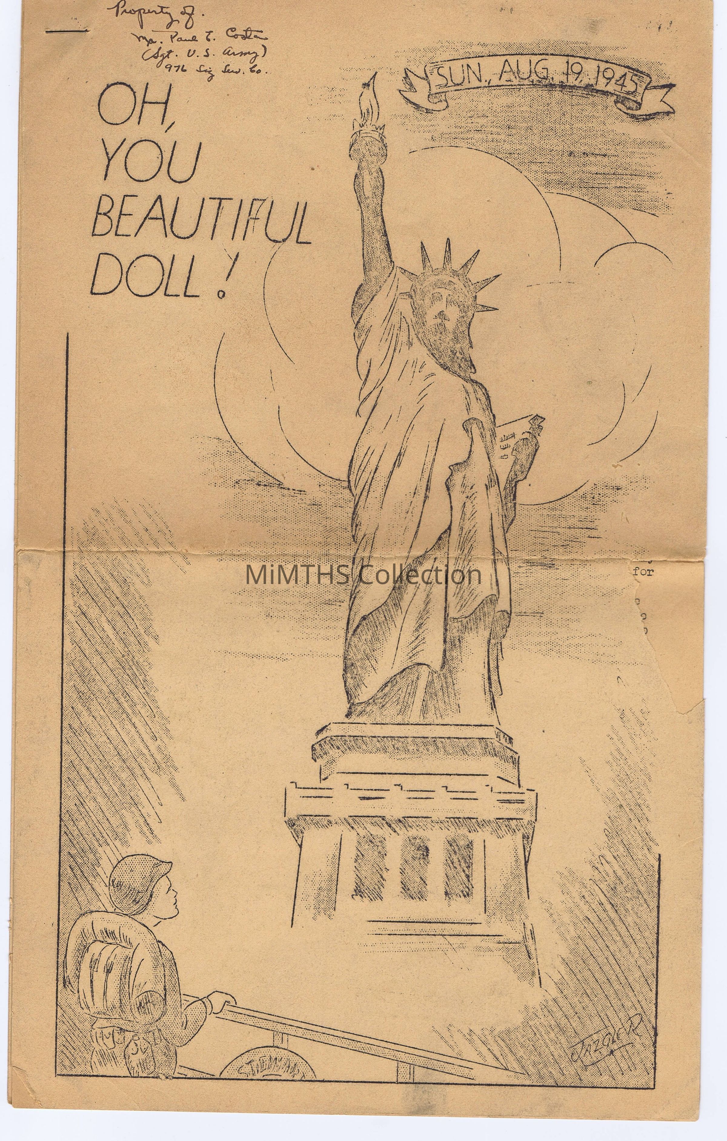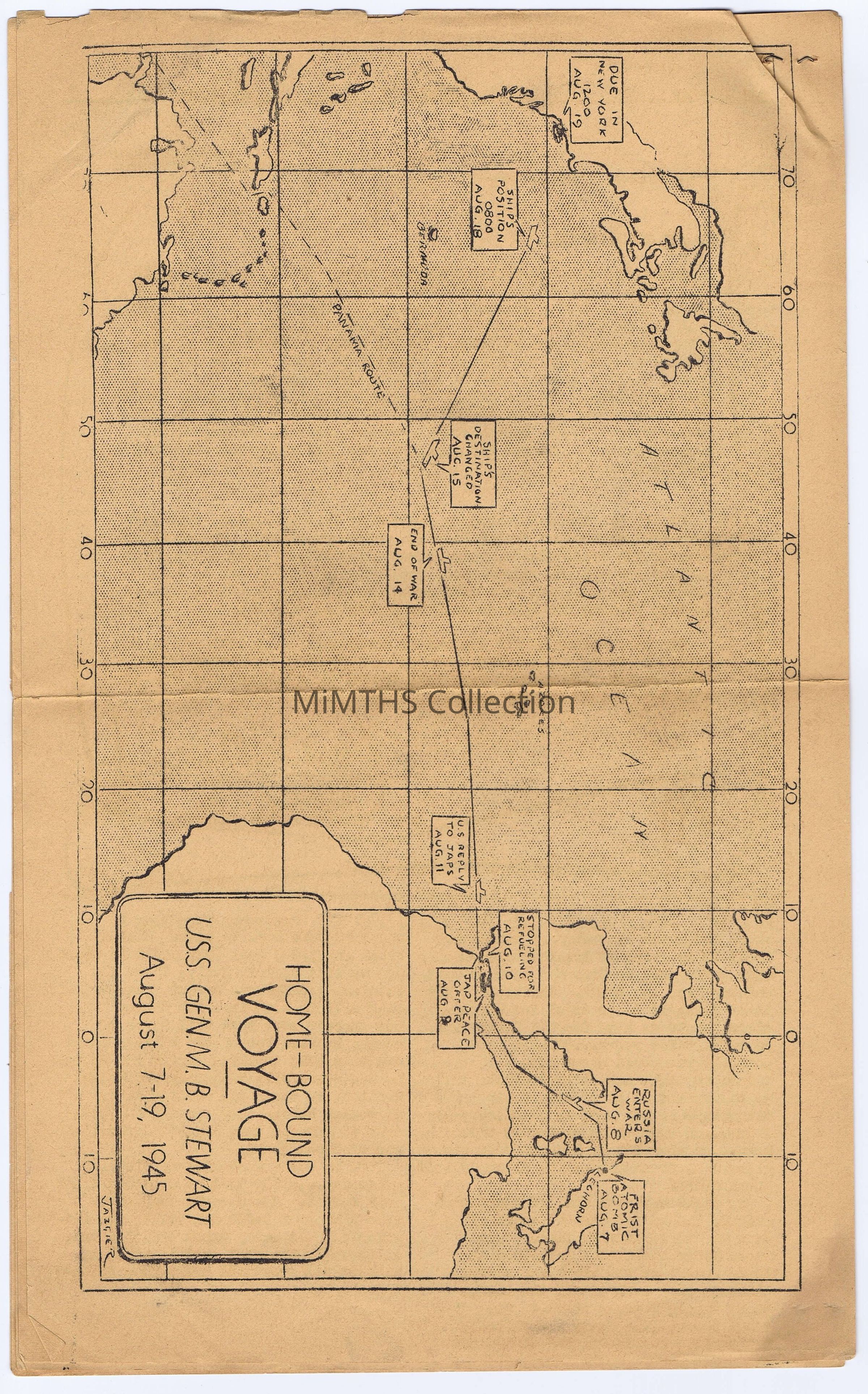 9 Page Newsletter from the transport ship USS General M.B. Stewart that delivered Paul Costa, among others from the 976th Signal Company and other corresponding units home to the United States from a port in Italy. It also served as a commemoration for the Allied Victory.Cataloged By