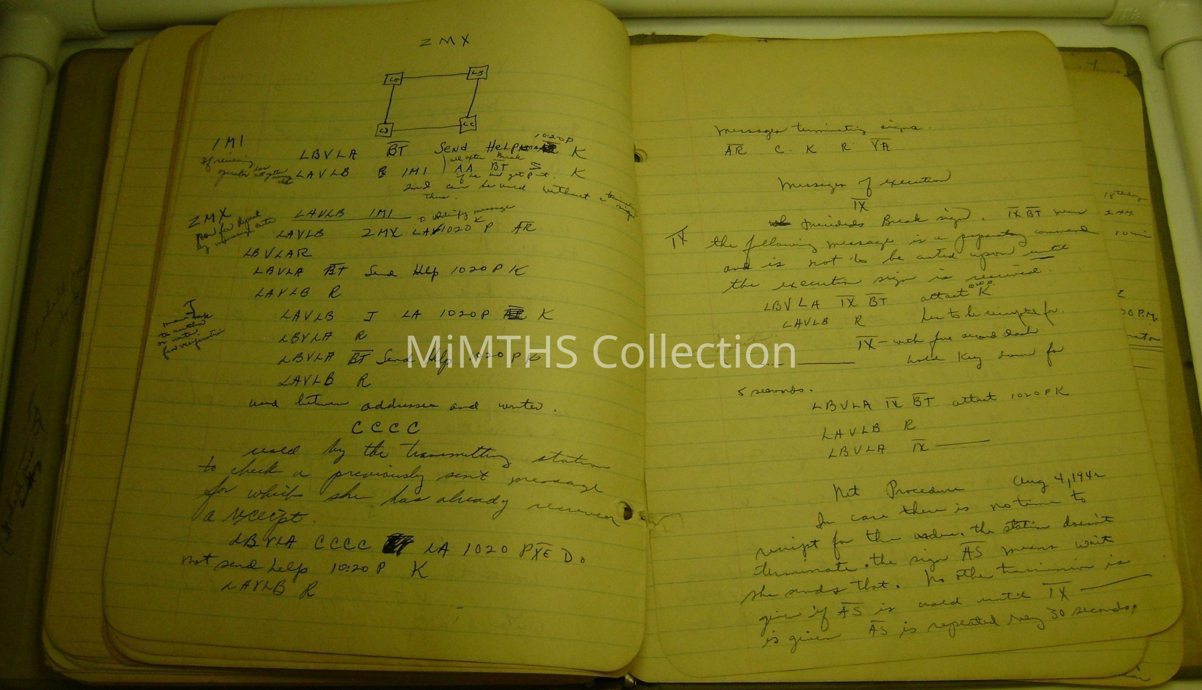 This scholastic notebook contains notes penciled by Paul E. Costa during his training on radios and other transmissive equipment he would use during his service. There are also loose sheets of paper with diagrams/drawings within.Cataloged By