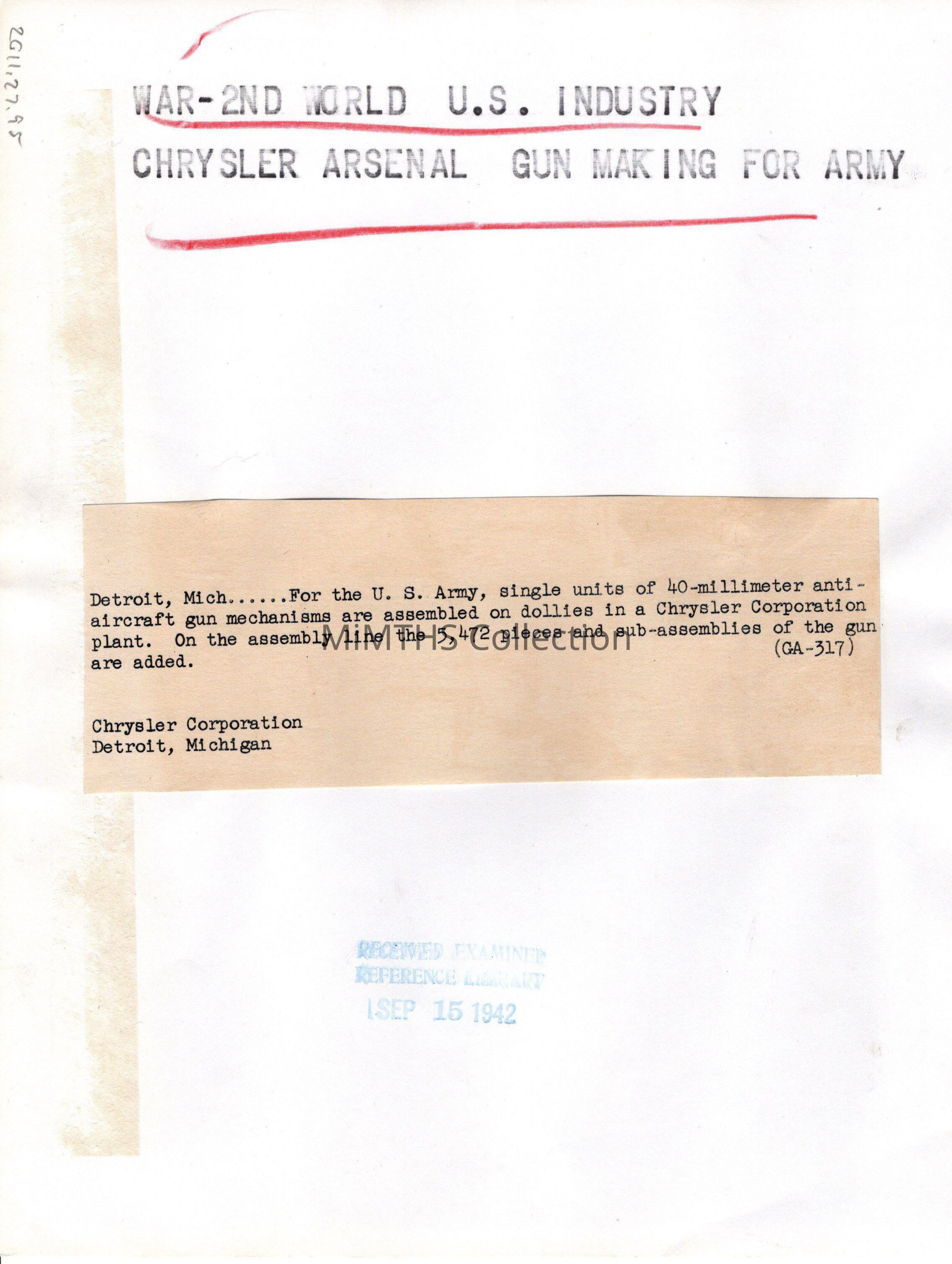 Detroit, Mich.... For the U.S. Army, single units of 40-millimeter anti-aircraft gun mechanisms are assembled on dollies in a Chrysler Corporation plant. On the assembly line the 5,472 pieces and sub-assemblies of the gun are added. GA-317 Chrysler Corporation Detroit, Michigan"Photograph Details