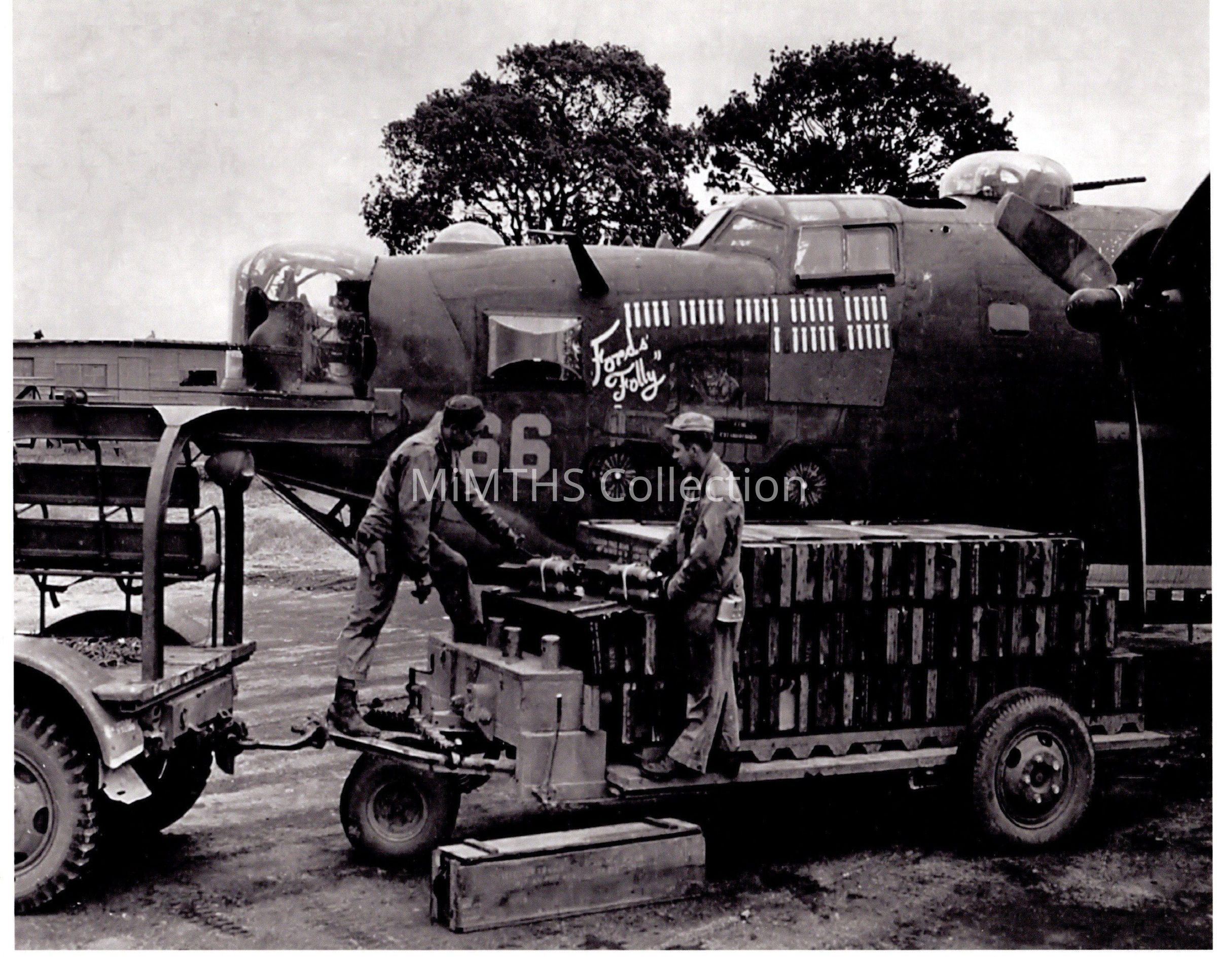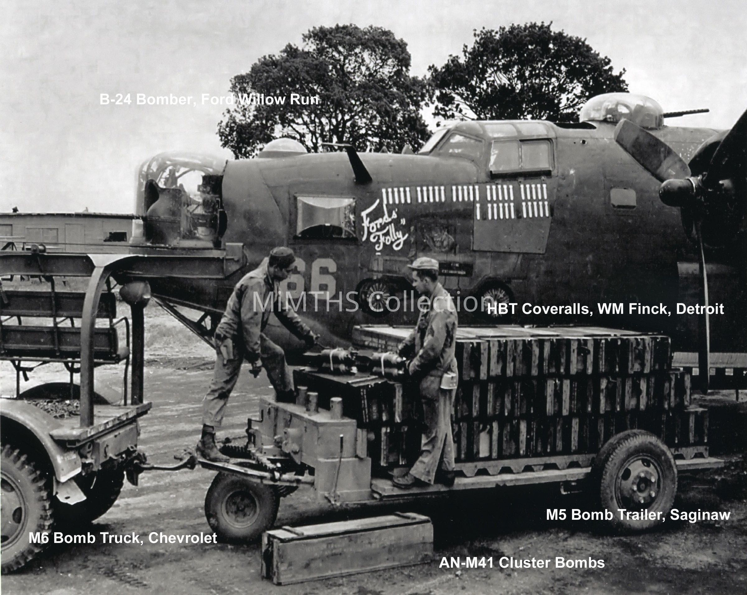 8x10" modern reprint on phot paper of B-24 "Fords Folly" photo, contains numerous Michigan made items, B-24, M5 Bomb Trailer, M41 Cluster Bombs, Chevrolet M6 Bomb Truck. >50 calibers, the propellers, the HBT coveralls worn by the 2 men.
