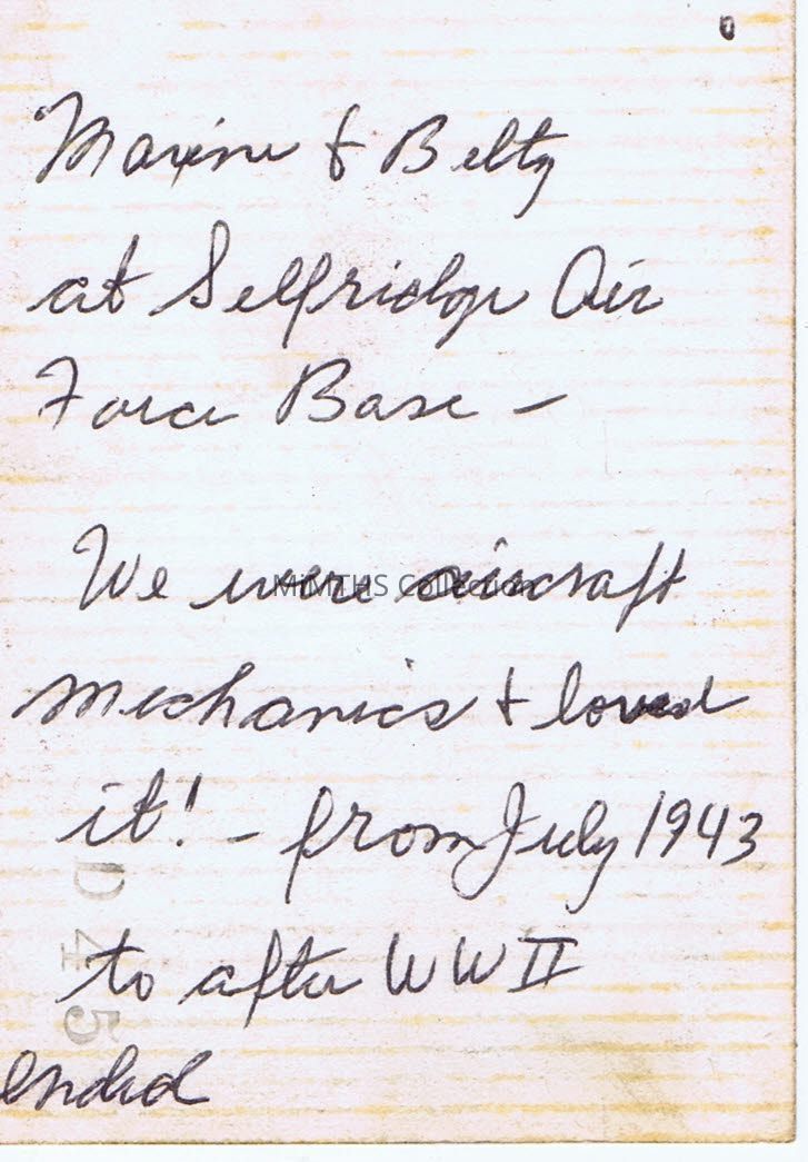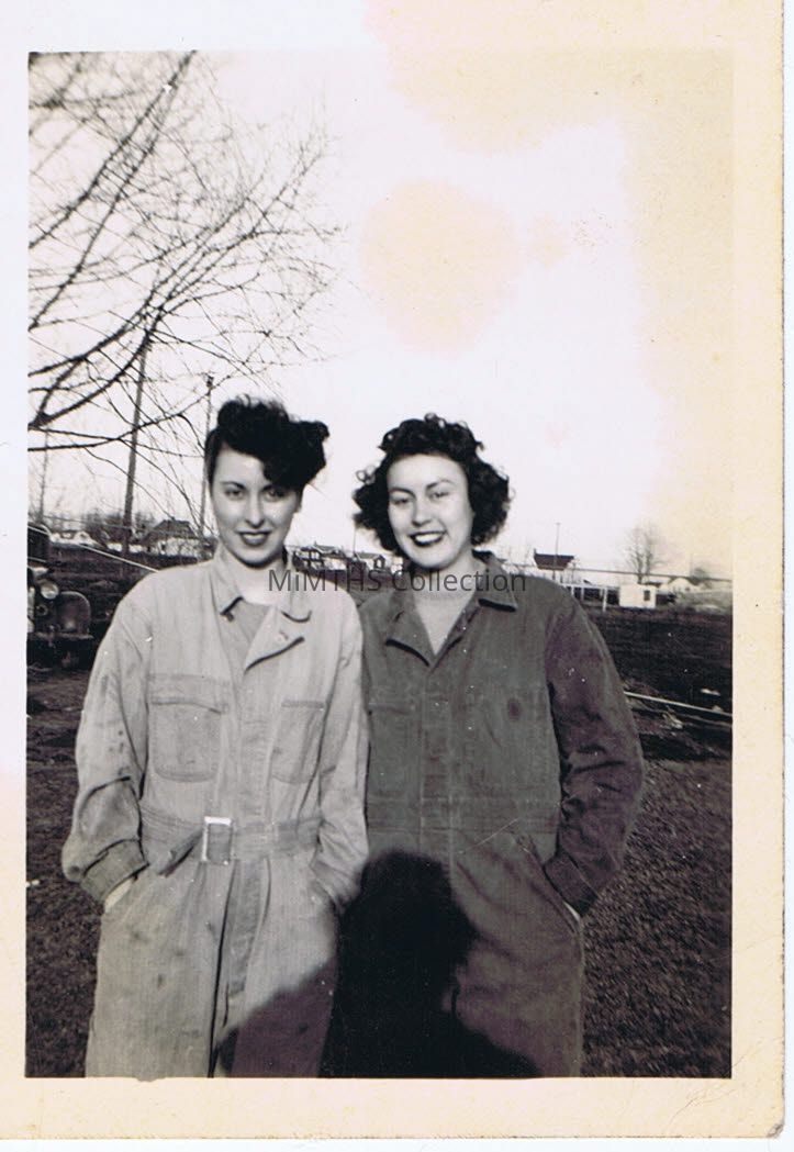 Photo marked as "Maxine and Betty at Selfridge Air Force Base - we were aircraft mechanics and loved it!" July 1943