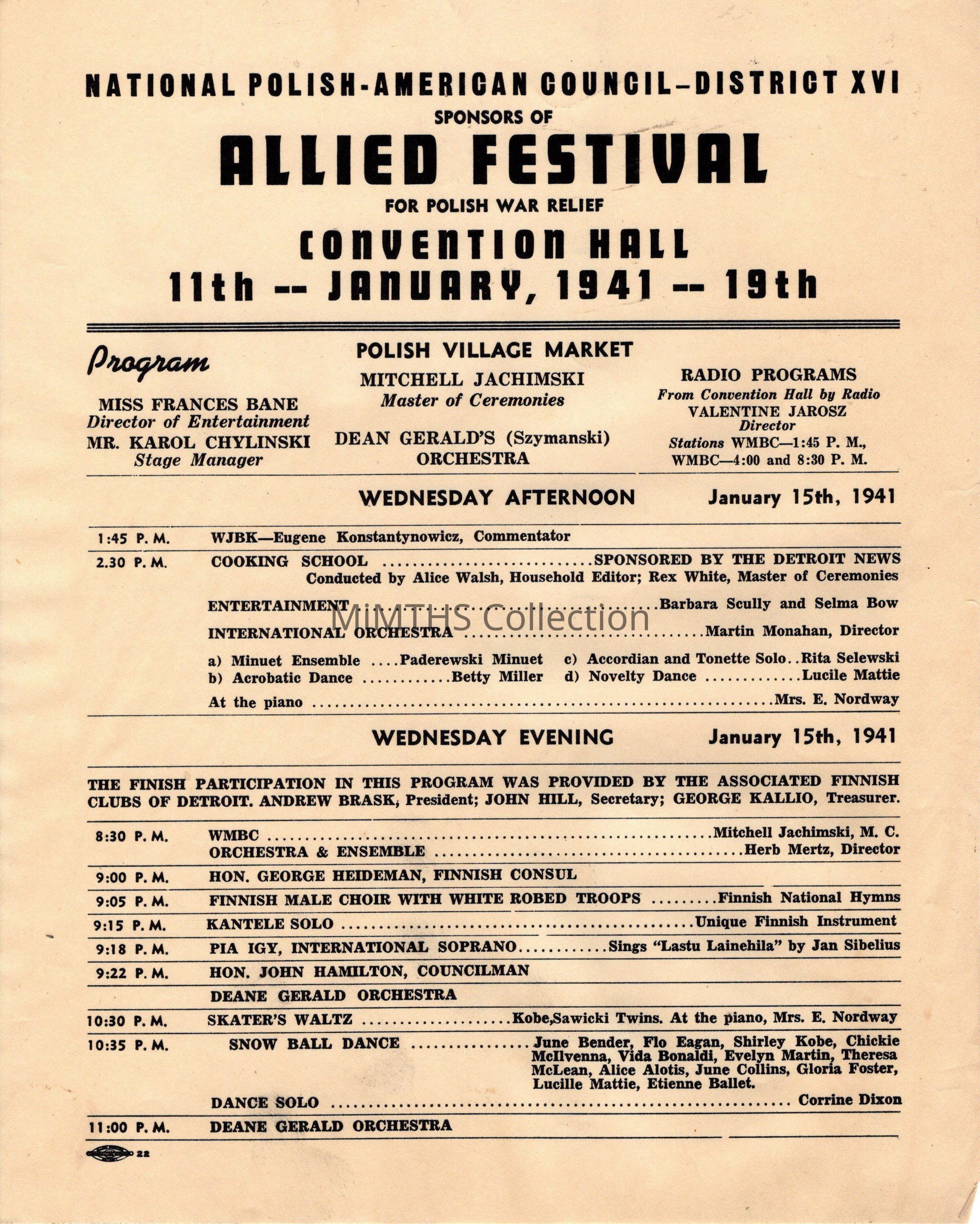 Booklet and program for the Allied Festival for Polish War Relief held in Detroit on January 11-19, 1941.