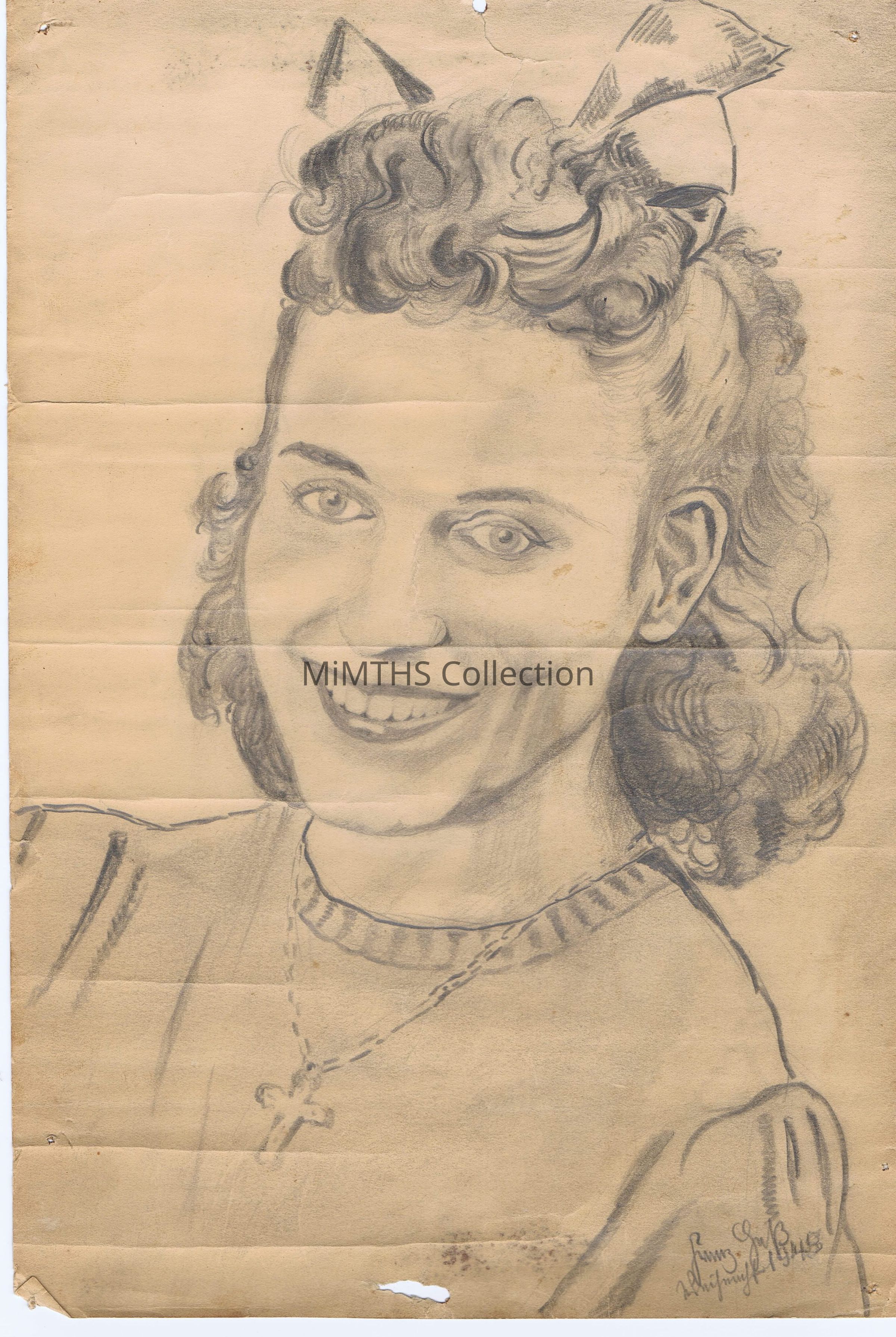 Approx 9"x13" pencil drawing of a girl done by a POW. Signed and dated 1945.